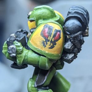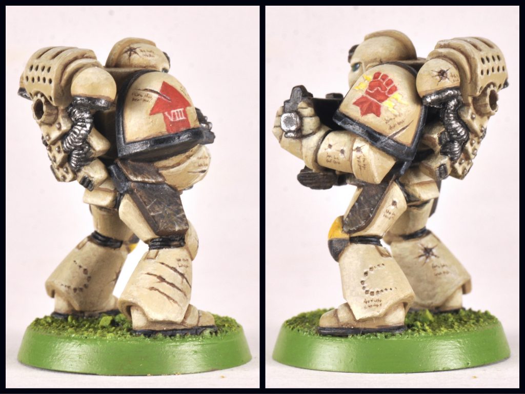 I went with the Excoriators Chapter to paint this little guy. Excoriators are a successor chapter to the Imperial Fists. They are featured in the Black Library novel Legion of the Damned by Rob Sanders, where the 5th company is left with a single survivor after the Chaos Cholercaust Blood Crusade descends upon the cemetery world of Certus Minor. Their most notable feature is merely repairing armor to a functional state then inscribing the date, place, and type of weapon that caused the battle damage next to it.