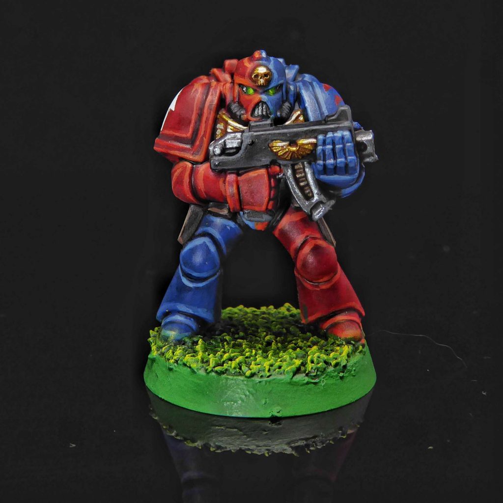 The only challenging part was the base because I normally don’t attach my models until they’re fully painted but this time my marine was shipped to me fully assembled. I did my best to make a little brown dirt field but definitely didn’t get as clean a drybrush as I would have liked. And some got on his legs, too. I guess he’s been tramping through the mud, so I left it on.