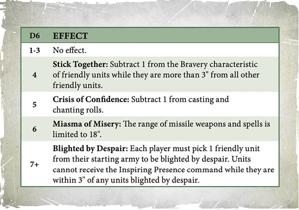 Blighted by Despair which forces both players to pick a friendly unit and then makes it impossible to use Inspiring Presence when within 3" of that unit. The roll is modified by how many players in the battle have a