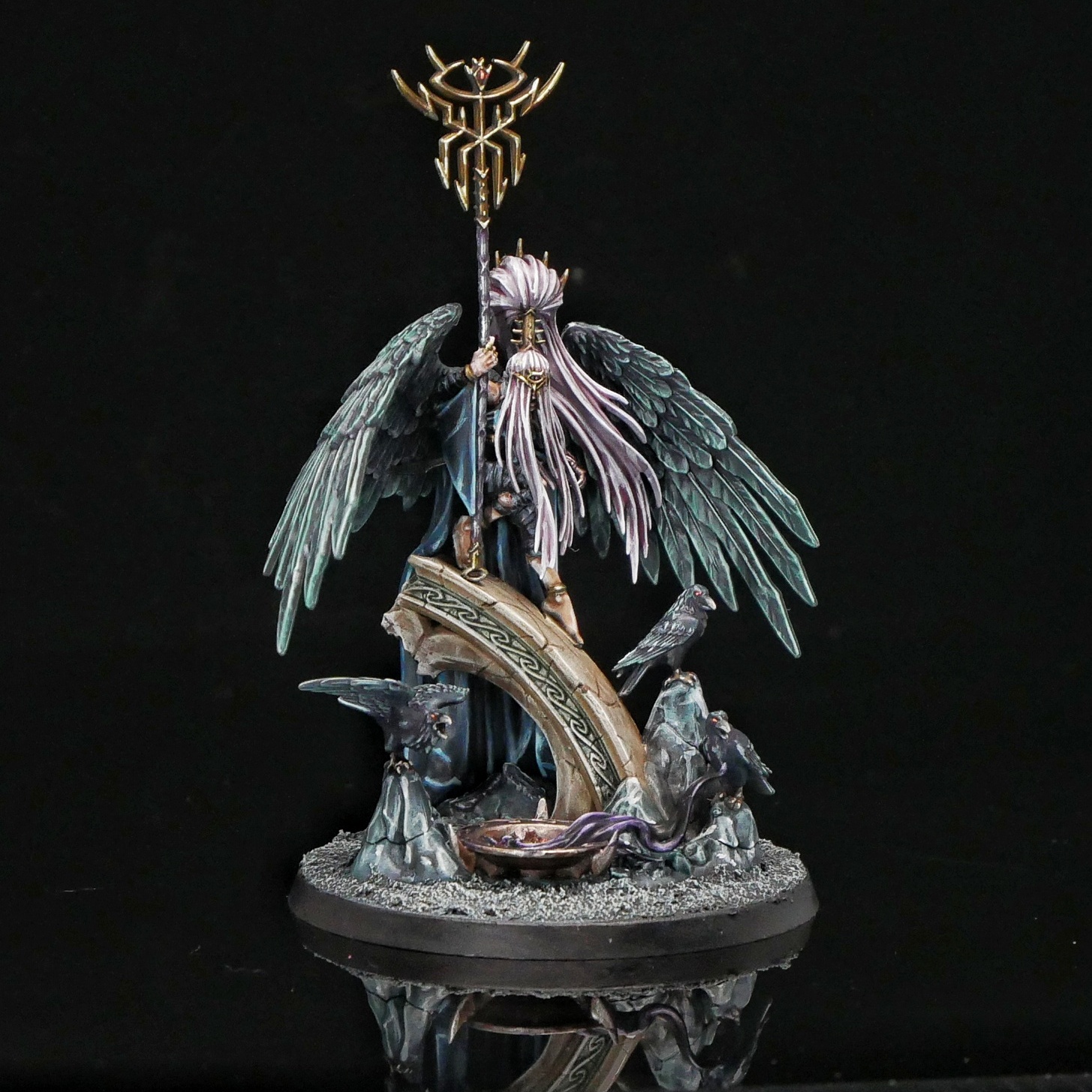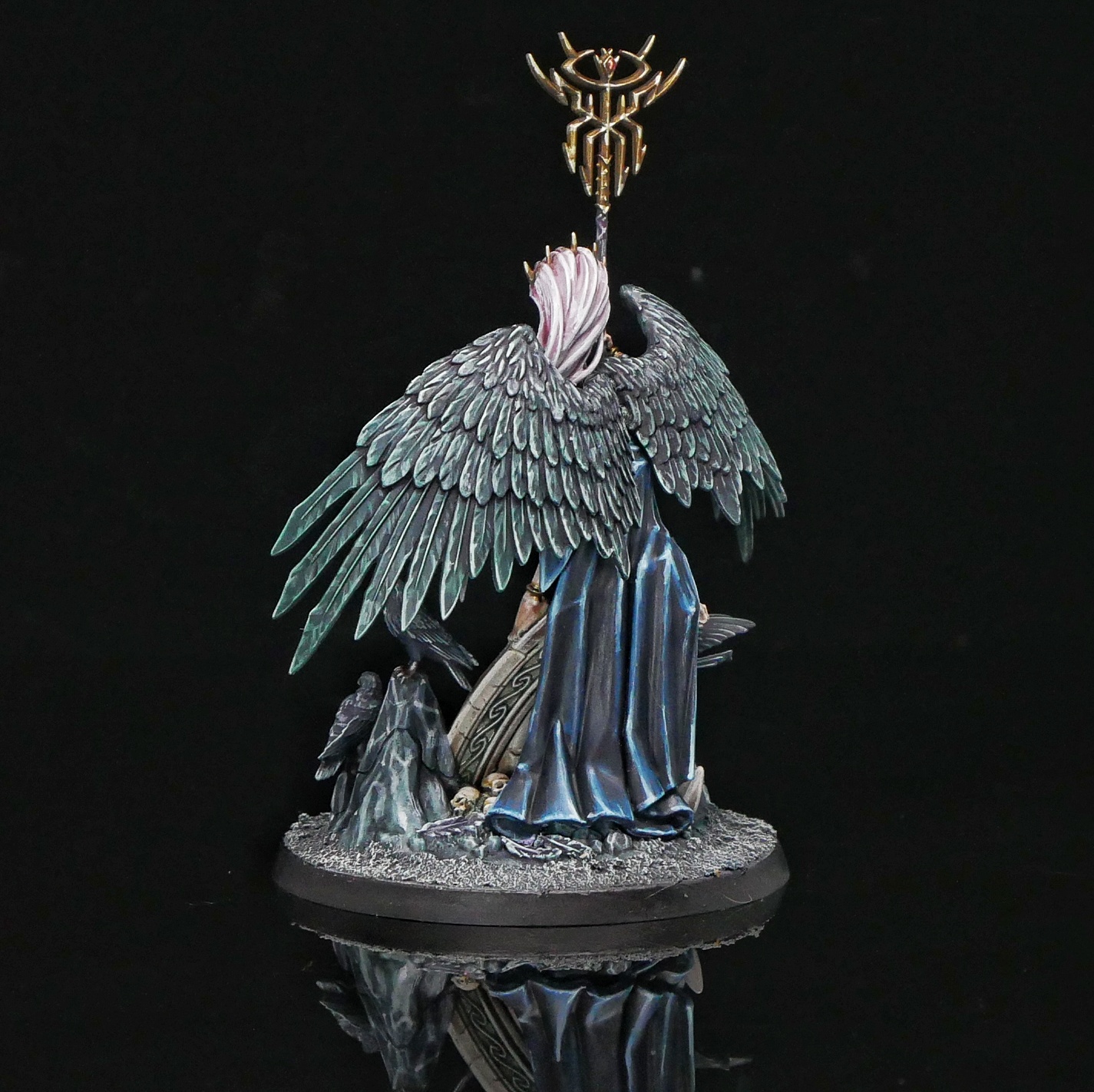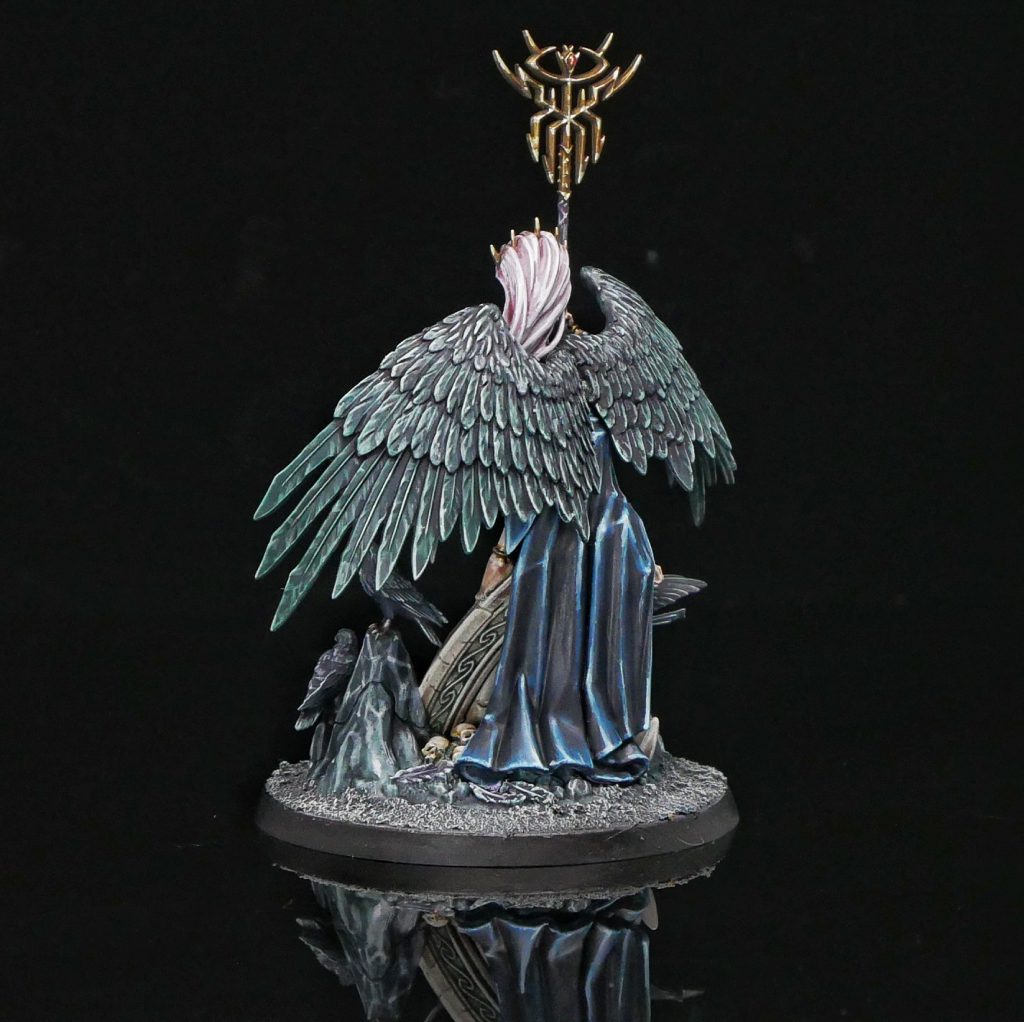 I went with a Shyish-style Krethusa, with a lot of pale greens, blues and purples to give the model a graveyard feeling. Painting her dress was a lot of fun - none of my space marines will ever be wearing a shiny blue-black goth dress, and it was a pleasure to stretch my skill to try to paint that texture. She's also blessed with three little bird guys, which are always a good time. The only pitfall I can think of is that you'd want to try to mask off the wing attachment ports with a little poster tack. The wings are large and heavy in comparison to the connection point, and you don't want any droopage while the glue sets.