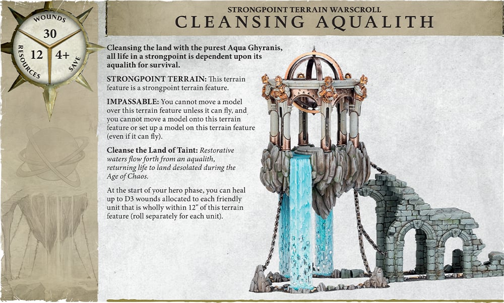 - Cleansing Aqualith: That's what I'm talking about baby. This is basically the Lumenith-looking terrain piece that was sold in the Thondian Strongpoint box that held the Incarnate, and it's full of "elf bullshit" if you're fighting against it. In addition to being extremely tanky at 30 wounds, this terrain heals each friendly unit wholly within 12" at the start of your hero phase. Given the size this is a great piece of terrain for only 12 resource points that lets you completely heal up small support heroes who have taken chip damage. Nurgle would HATE having to deal with this terrain piece on a regular basis.