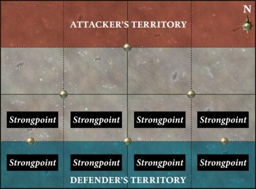 The main show, however, are the Strongpoint bases that include all of the special terrain from the strongpoints. The defender gets 50 strongpoint resources to set up allowing them to put a decent number of non-wall resources. For final scores, however, the defender can only earn up to 6 points vs. up to 15 for the attacker with a draw heavily favoring the attacker. This tracks as the battle is asymmetrical with the defender easily controlling three objectives, with two in no-mans land, and a single objective in the attackers territory.