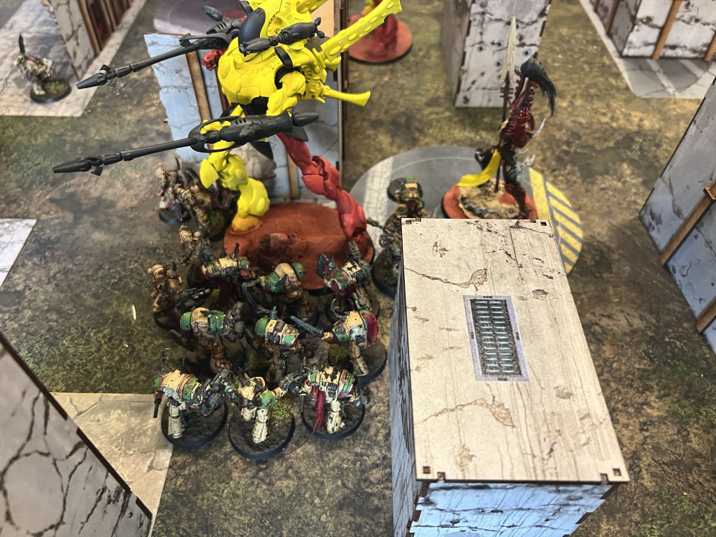 oh boy did it happen. This was huge and honestly came down to me rolling an 11" charge out of Deepstrike with Typhus and the Deathshroud (I went first so didn't want to wait and rapid ingress, that would have cost me the game) and killing 5 of the Wardens with Trajan with just shooting from all my terminators and Plagueburst Crawlers; only their mortars were able to shoot, too, due to placement and ruins being in the way. I'm not sure if I've ever seen so many 1's and 2's rolled to fail saves. But it's a dice game, and that's how it goes sometimes. Trajan moment shackled to strike first, other Custodes also used a strat to strike first which meant he didn't have enough CP to cause -1 Damage from my weapons. Trajan and Co killed all 3 Deathshroud with his remaining Wardens and Typhus swung back...killing the remaining Wardens. Blightlords charged into the block of custodian guard with Mortarion to help clear them off and were subsequently charged by the
