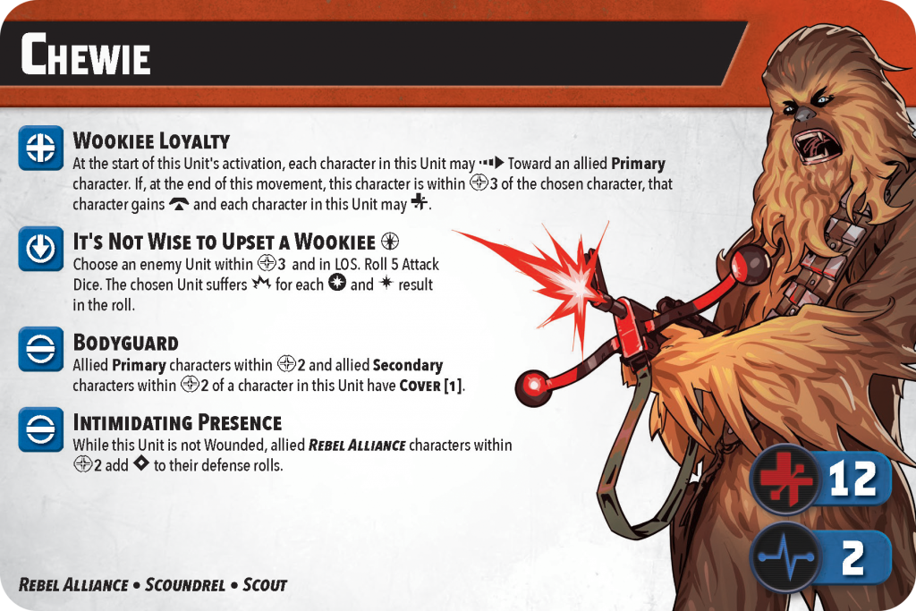 Intimidating Presence will help protect your other units from attacks. It is important to remember, though, that all of Chewie’s abilities require him to be within range 2 or 3 of whoever he’s targeting, so you will need to make sure he stays in the thick of the action.