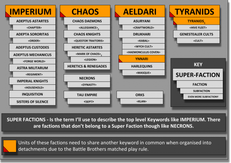 I think this chart covers most faction choices; however making it probably took longer than the rest of this article and knowing GW there’s probably some I’ve missed. My apologies if your favourite army is missing - I promise that it wasn’t intentional! All the units in every detachment of your army must share one faction keyword; it could by Imperium it could be Astra Millitarum, it could be a particular Chapter of Space Marines.