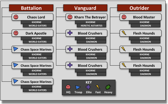 The Battalion Detachment would gain the World Eaters Legion Trait, the Vanguard Detachment would not gain any special abilities but is still legal thanks to the shared KHORNE keyword. Lastly, the Outrider is a pure Khorne Daemons Detachment and would gain the associated ability for being dedicated to a single Chaos god.