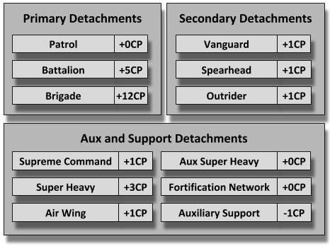 A detachment is a collection of units (some that might just be one model) organised to fit a detachment template. There are a selection of different detachment templates to choose from roughly fitting in three types. Each one gives you a number of Command Points (CP) that can be spent on Stratagems before and during the game.
