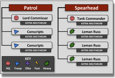 Each detachment has some mandatory slots you have to fill, like an HQ or some Troops, plus varying numbers of free slots you can fill with additional unit choices. More details on these can be found on pages 243 to 245 of the Warhammer 40,000 rule book. The CP bonuses I've listed here have been updated to reflect the latest FAQs. When building an detachments, you need to decide which faction you are using for the detachment - this is the keyword that will be shared by every unit in the detachment, though note that there are some limits to which keywords you can use in this way: