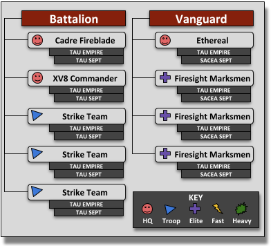 Notice that these detachments each have different subfactions. This is still a legal army because the whole army shares the T'AU EMPIRE keyword. The units in these detachments would respectively get the abilities of each of these Septs as shown on page 127 of the T'au Empire Codex, but doing this does come with some limitations. There are abilities in the game that are locked to the subfaction of the model/unit using it; if we take Tau as our example again, the Saviour Protocols ability can only be used to protect units of the same <SEPT>.