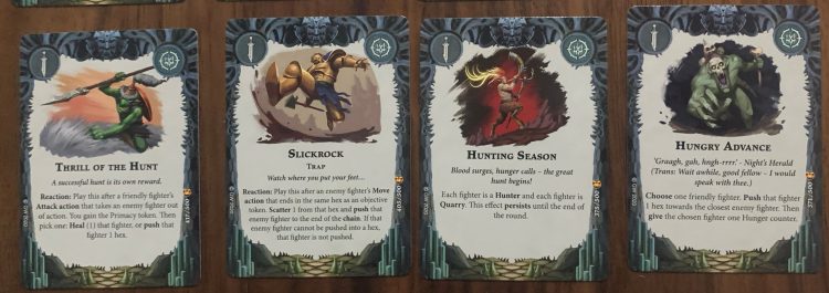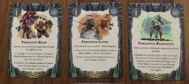 I’m hesitant to rate this card too highly, given that there’s a chance it fails altogether. However, on high-wound fighters this is basically “heal half”, which is a great effect, especially in conjunction with +Wound upgrades or cards that reduce incoming damage. Again, hard to evaluate the Hunger portion of it, but by itself on Hrothgorn, Mollog, or any 4 Wound fighter with Upgrades, there’s solid potential here.