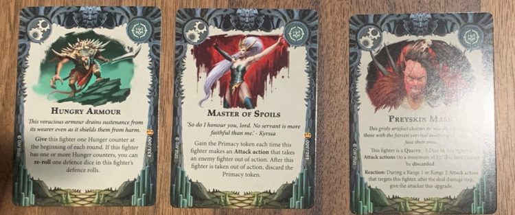 Editor: This fighter is a Quarry. -1 Dice to this fighters Attack action. As a Reaction, you can give this to an enemy that attacks your fighter then they're stuck with iti. The design of this card is excellent. It’s a debuff, but it’s also a detriment if your opponents attack you. If you’re a resurrecting warband, you can put this on a fighter with weapon upgrades and give your opponent very difficult choices. That said, it is a self debuff, and your opponent can always choose to “soak” the effect by attacking with a less important fighter. And it’s basically a dead card vs more passive playstyles, so take with caution.