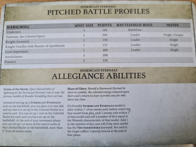 Scions of the Storm lets you set up one unit in the Celestial Realm for every one unit you deploy at the start of the game. These units can then be set up on the battlefield more than 9” away from enemy units at the end of one of your movement phases. This will be familiar to anyone who’s taken a look at Stormcast in the past, but something to note here is that it’s missing the final line in the Battletome about units not deployed before the fourth battle round are slain. We’re going to assume this was cut for the sake of time, and that you can’t drop down in round four or five, but you should absolutely check how your opponent or event organiser is going to run this.