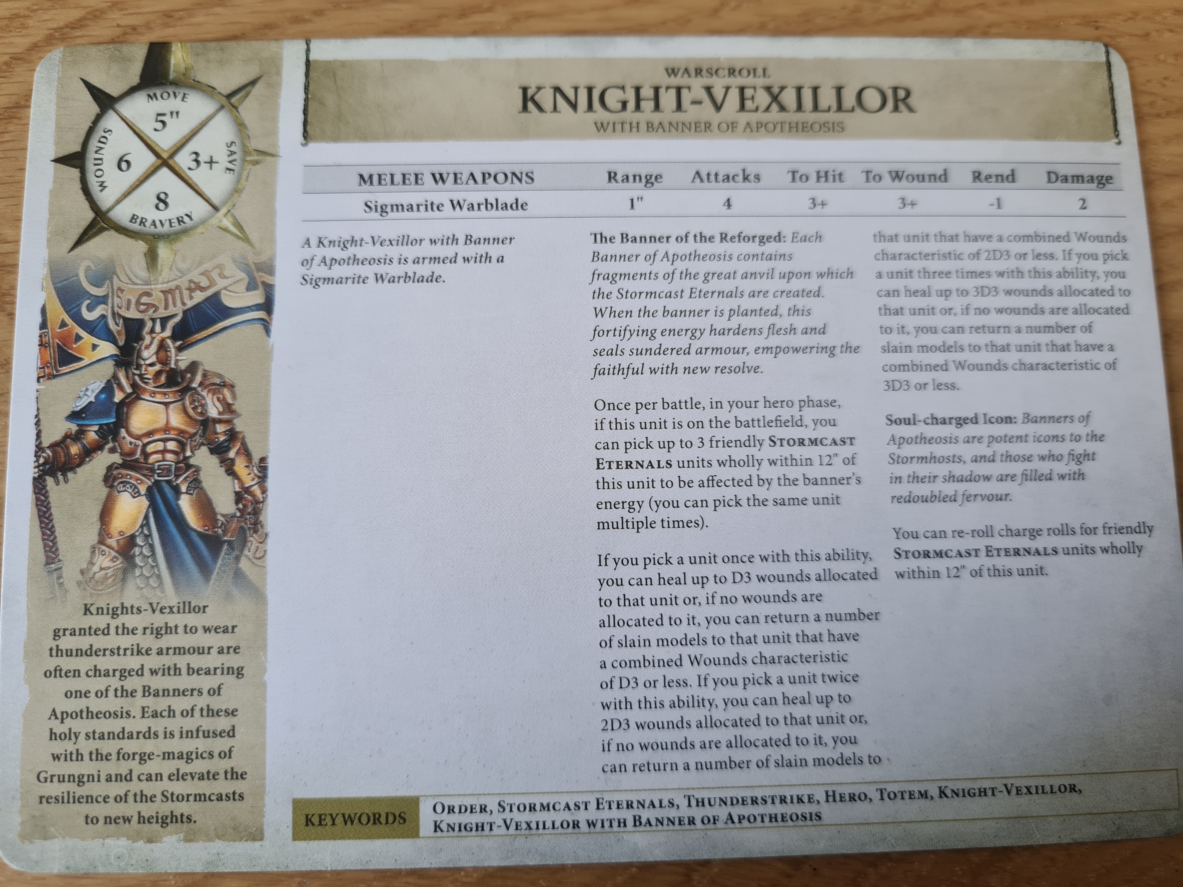 Graced with the longest rules text of this box, the Banner of the Reforged allows you to, once per battle, pick up to three friendly Stormcast units to be affected. Those units either heal D3 or, if no units are wounded, return a number of slain models with a combined wounds characteristic of D3 or less. If you picked only one unit to be affected, the total is 3D3, and if you picked two units, one is 2D3 and the other is D3. Death players, yes, Stormcast have better resurrection than most of you right now, at least in this one model. Remember though that you can’t bring a model back wounded, and with the lowest wounds characteristic in the army being 2 you’re gambling every time you activate this banner. I’d probably recommend picking one unit and doubling down with Yndrasta to potentially bring back four 3 wound models in a single turn.