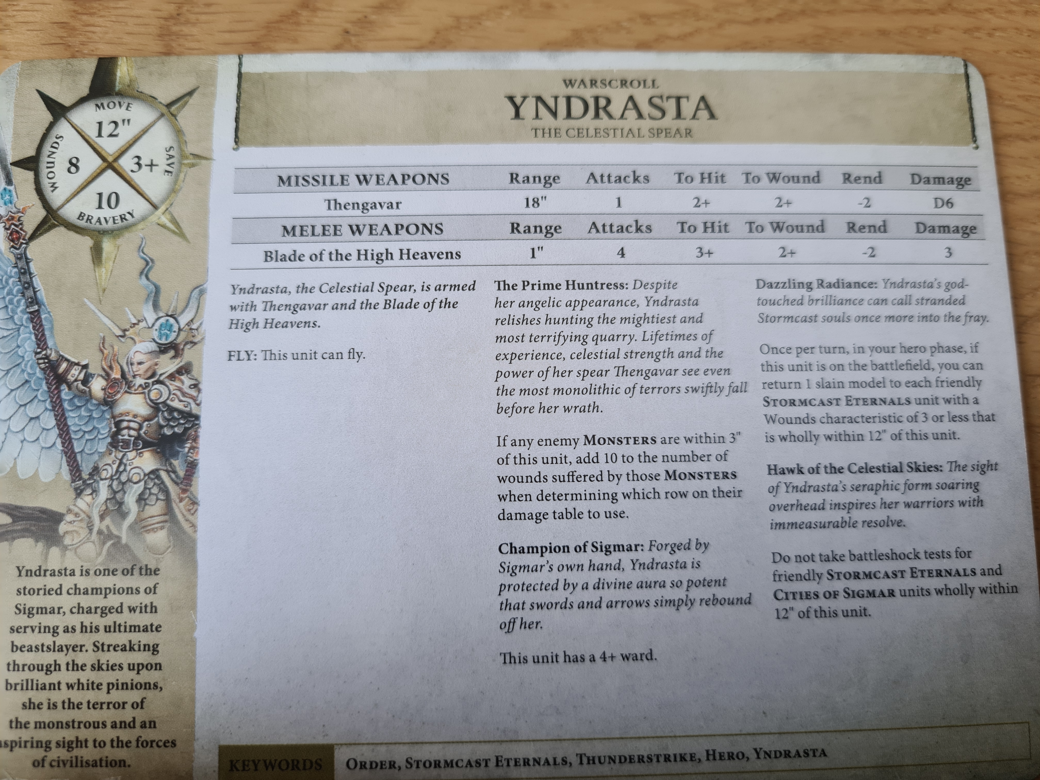 Finally, I've chosen to compare Yndrasta to the one she's apparently taken the job of, the Celestant Prime. The Prime is only 40 points more, but for that you get a little AoE shooting attack that inflicts mortal wounds (as opposed to Yndrasta's cool spear), a much better melee profile (