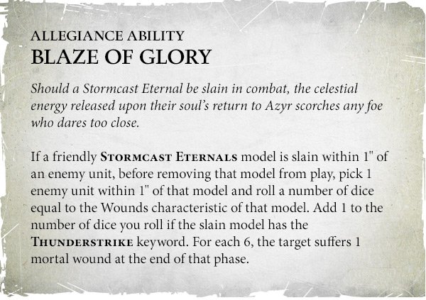 Blaze of Glory is brand new ability, representing your tiny armoured children exploding into lightning upon their death and return to the forges of Azyr. When a Stormcast model is slain within 1” of an enemy unit, you can roll a number of dice equal to the Wounds characteristic of that model, adding one more if it was Thunderstrike (the new breed of Stormcast). On a 6, inflict a mortal wound. Alright, it’s not remotely as good as the Kruleboyz ability to do mortal wounds on a 6 to hit, but it’s still something, right? ...right?