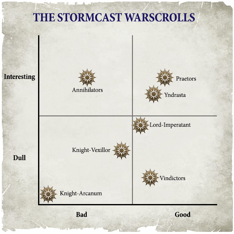 It's not an inspiring graph, but there's a fairly decent spread in here. Praetors and Yndrasta are the real winners, while Annihilators are interesting, Lord-Imperatants and Knight-Vexillors both have use cases, and Vindictors are your bog standard vanilla battleline. The only real loser here is the Knight-Arcanum, who really just needs to go home and level up to become a Lord-Arcanum before being interesting again.
