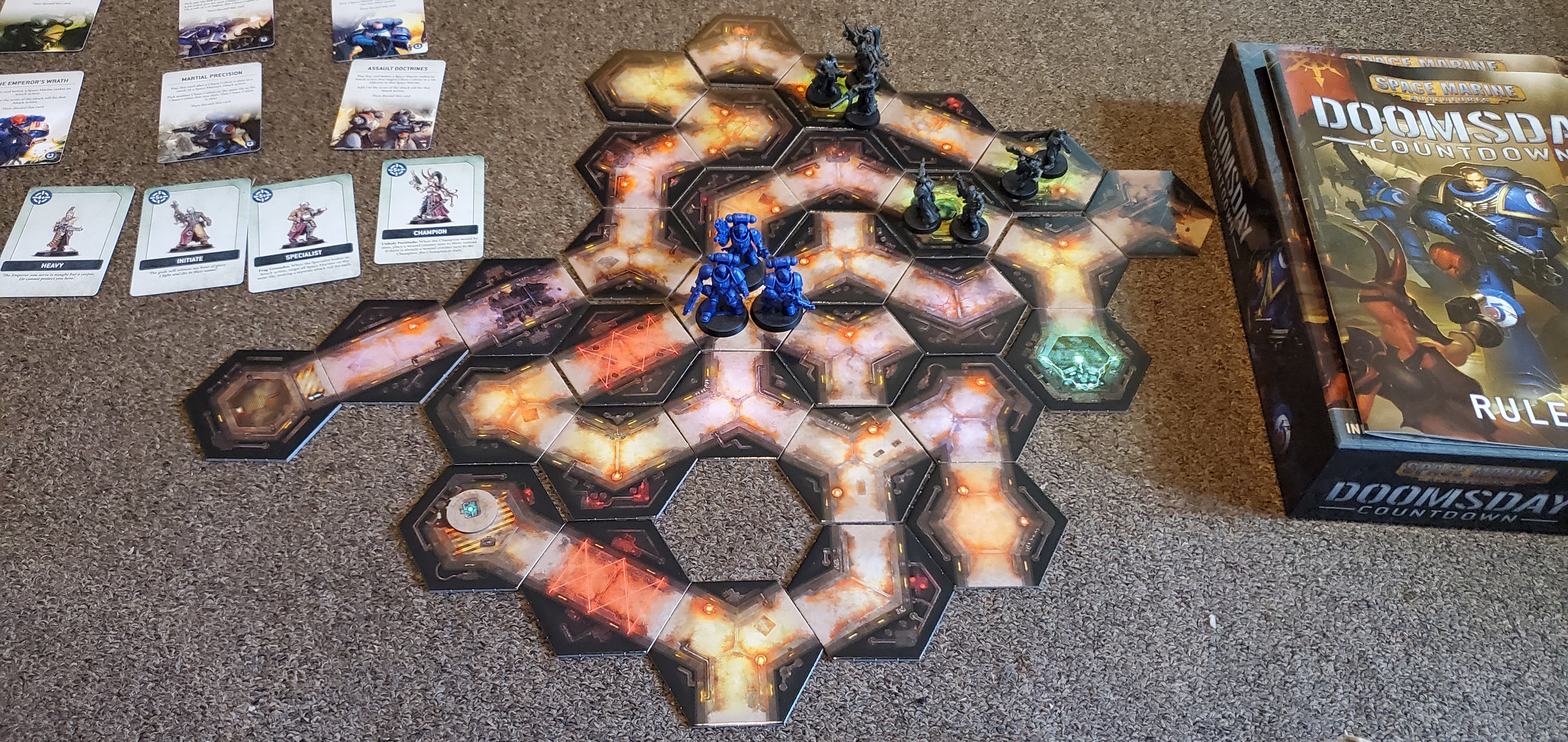 Setup for the game is fairly simple. Each player takes a Space Marine with a unique ability. If there are 2 players one takes control of two of them while in solo play you simply control all 3. Each player is randomly dealt 2 Wargear cards that grant one time use abilities like the ability to add +1 to hit rolls or heal a wound. Finally the board is set up. A center hex is placed allowing you to branch off into 6 directions, though 3 additional starting hexes are always placed to get you started. Then a player shuffles up all the hexes and plants them until every the hexes are down and connected into a randomly generated maze. The defuse code is placed on the specifically marked hex and finally, cultists are placed on one of three "spawn points". Set the counter to 20 and off to the races you go.