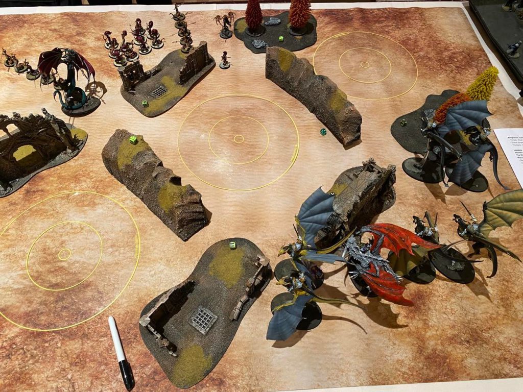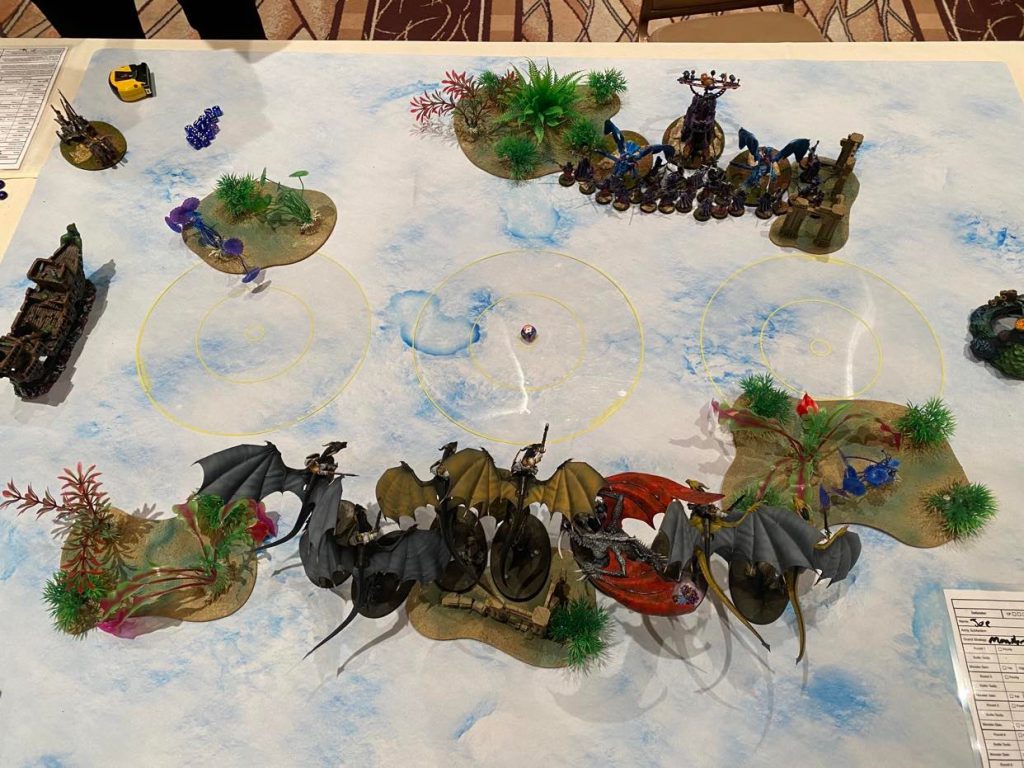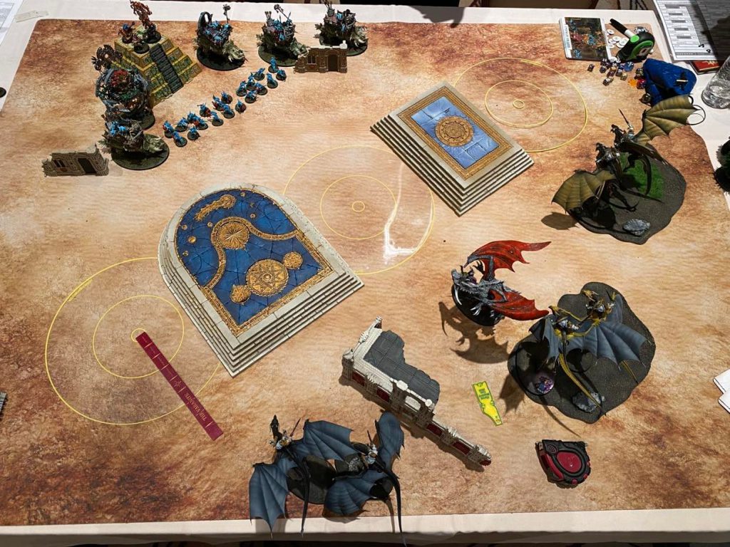 I definitely pulled a hard ask Round 1 and my opponent was ready to give me a run for my money. I took Round 1, chose "Ferocious Advance" on 3 monster units, deep-struck 3 Aether-wings on the bottom objective and tapped 2 dragons on the farthest side of the top objective away from the angry dwarf, and passed turn.