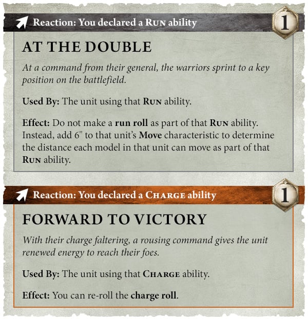 Core Rules 11.2 - "Forward to Victory - Nothing will stop these ferocious warriors from reaching combat. You can use this command ability after you make a charge roll for a friendly unit. That unit must receive the command. You can re-roll the charge roll for that unit."