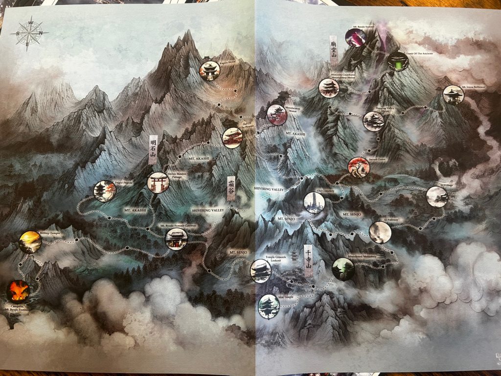 - A stack of glossy cardboard pieces that together form the various environments that the heroes will battle through as they ascend Mount Byodo. These are all two-sided, allowing for even more variety in location, and come in several sizes. There are also three cards, the same size as the stat cards, that represent secret locations you might uncover during play.
