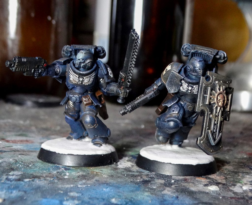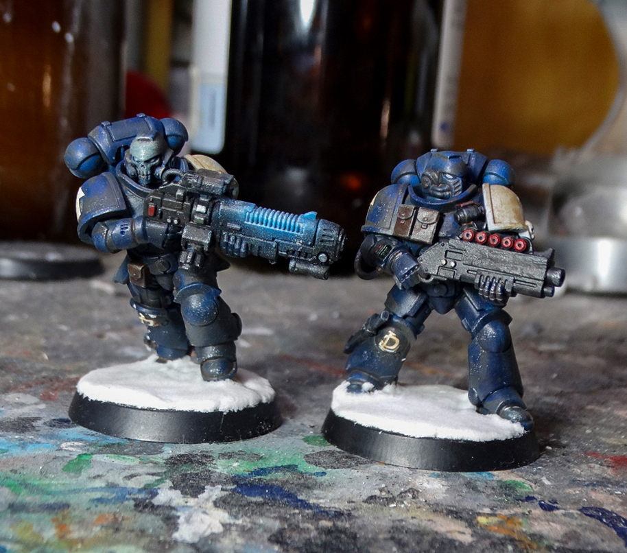 Two of my Primaris-scale tactical marines are here, and very angry about something. In keeping with the tactical squad theme of mega versatility, I did small conversion work on a lot of them. Mostly in weapons. I was aiming for 'generic but flexible, which to me, is the soul of a tactical squad. That means not going ham on conversion work, but making sure everyone has a part.
