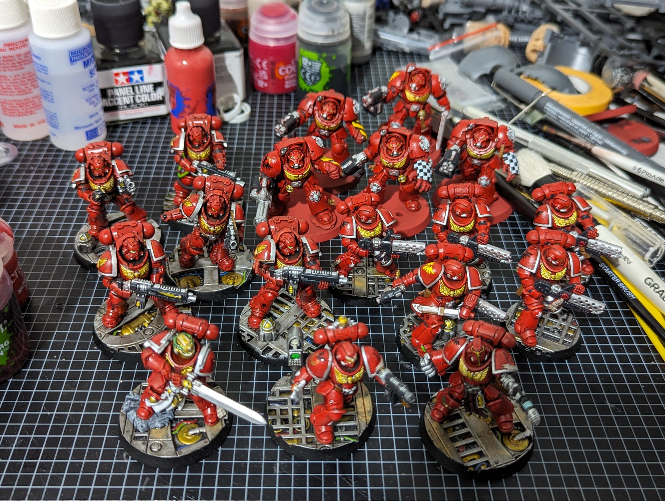 2 Primaris Lieutenants (a spare assault intercessor body gets you two from the new multipart lieutenant sprue), a Primaris Company Champion, 5 Heavy Intercessors and 5 Infernus marines. I got the new Terminator squad to a tabletop standard but not based, putting me within spitting distance of having the new marine combat patrol completed.