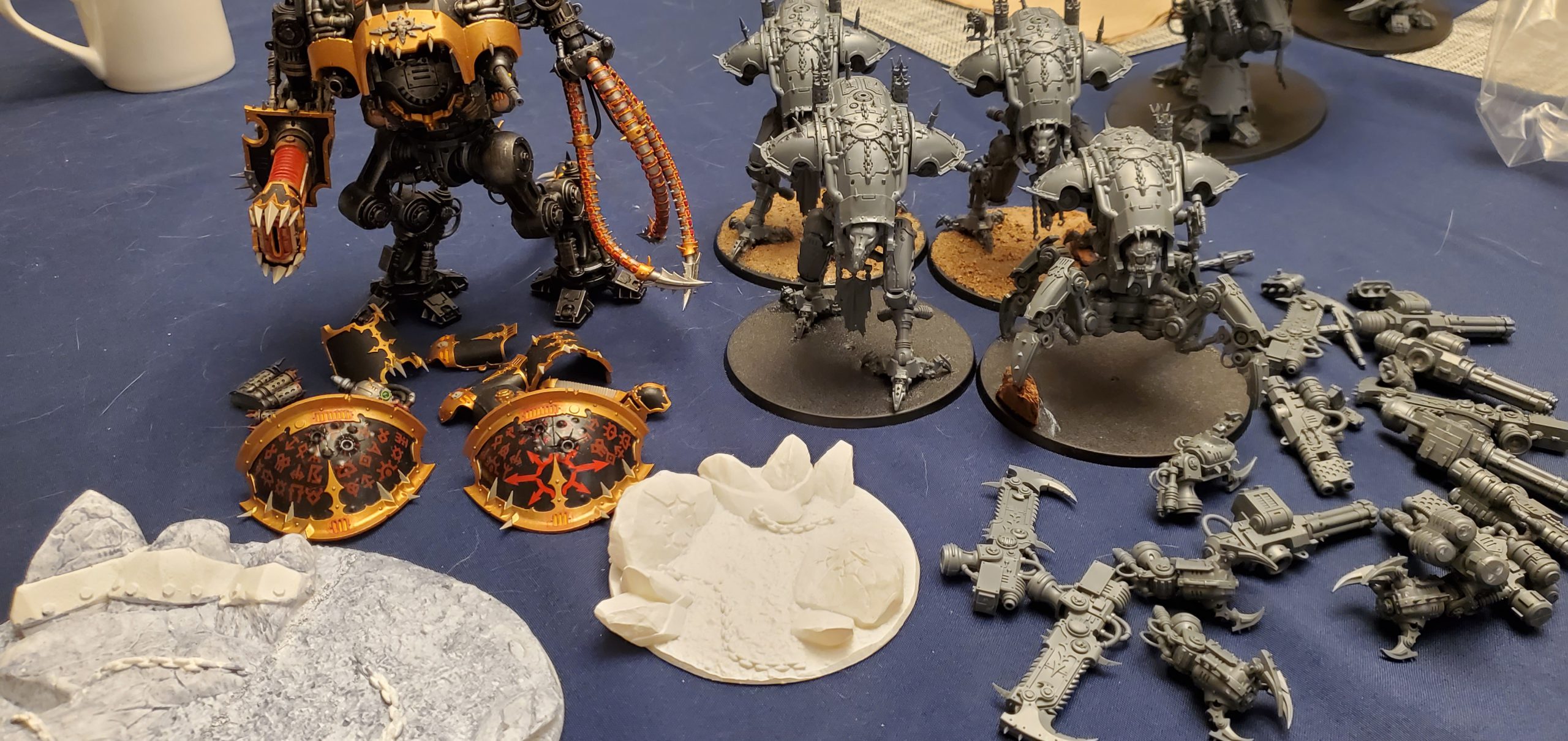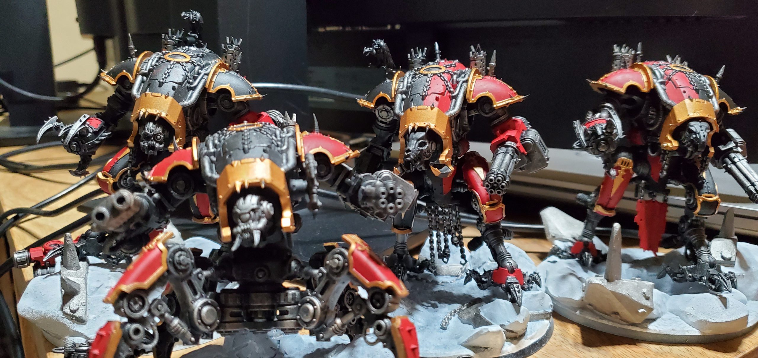 More Chaos Knight action, this time with getting close to 1k of knights painted up. Getting that amount of stuff done is a great achievement, and gets you putting an army on the table and playing games with it.