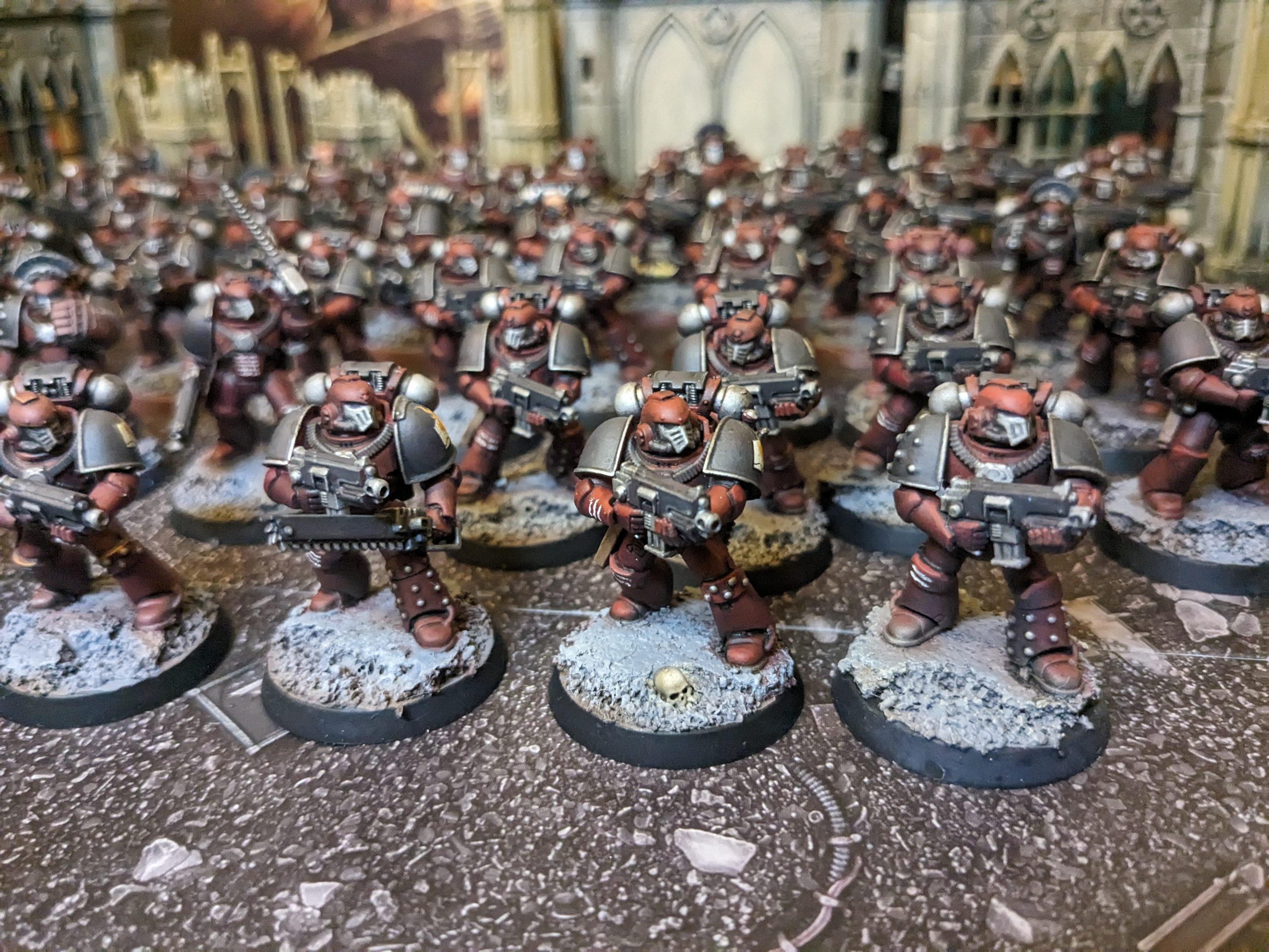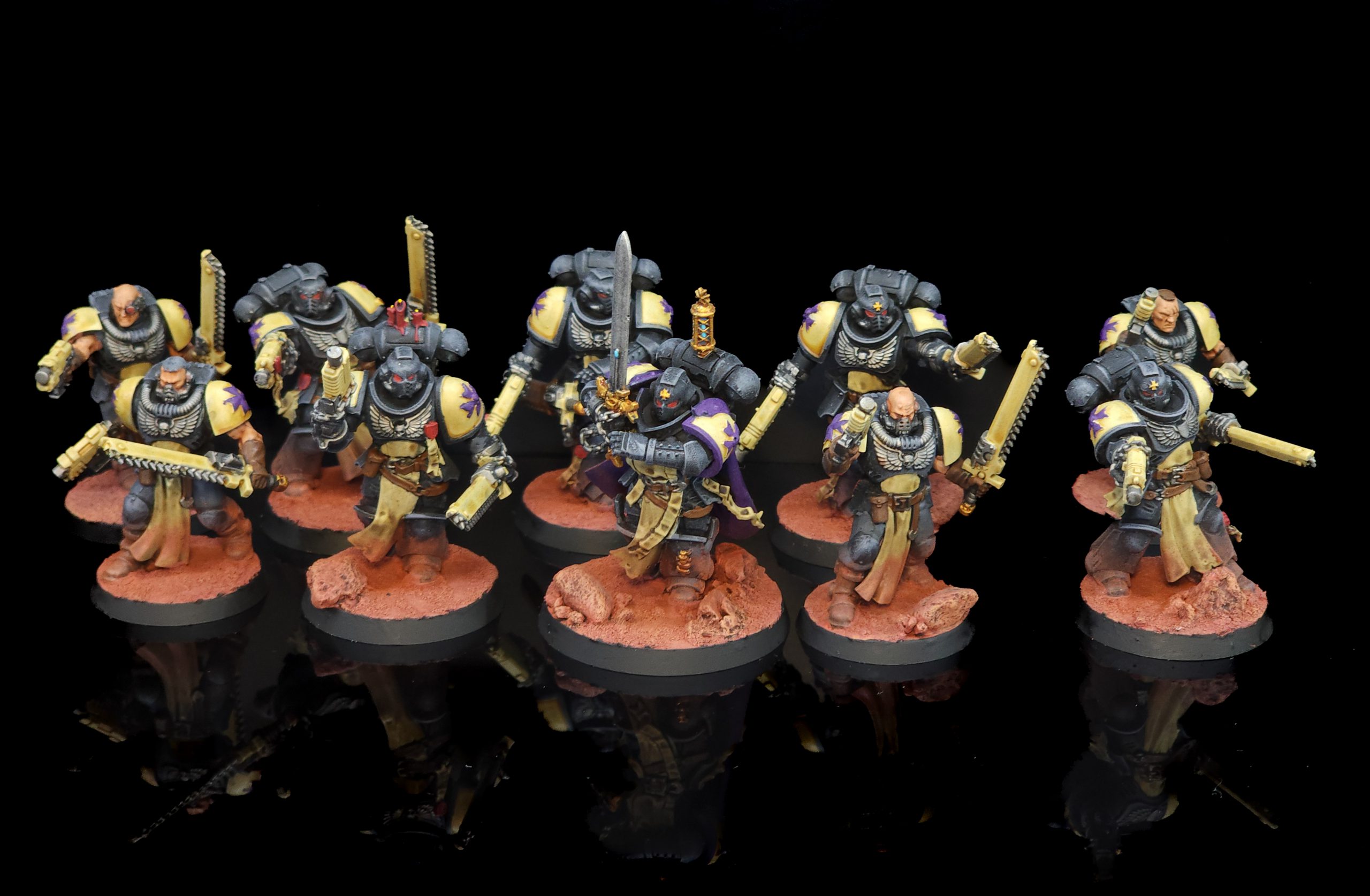 This Tactical Squad consists of the classic two combat squads (no longer a thing in 10th Edition). The first combat squad is a short-ranged element led by a veteran sergeant and former Deathwatch trooper. They have a smattering of short-ranged weaponry for doorkicking and similar operations. A good excuse to break out some Deathwatch bits.