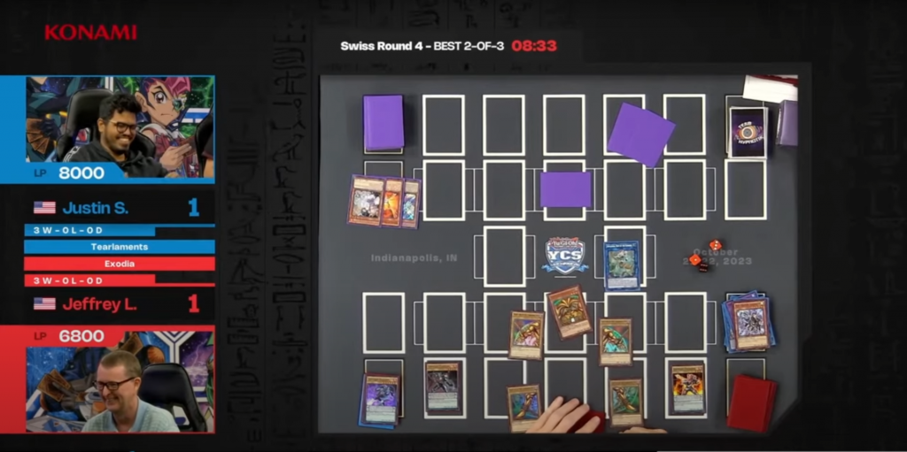 Fast forward to the weekend of October 21st 2023 and Jeff Leonard has entered YCS Indianapolis with a very special deck. Mystic Mine has been banned for 10 months. Jeff stuns his first round opponent by playing a deck dedicated to resolving the effect of Exodia, The Forbidden One. This hero proceeds to win his best-of-3 in rounds 1, 2, and 3 of the two-day, 1,958-player tournament. In round 4 Konami officials placed Jeff’s match on stage and on stream as a feature. Jeff’s opponent would be Justin Singh, a storied veteran in the Yu-Gi-Oh! competitive circuit with several top cut finishes in major tournaments and a participant in the most recent World Championship. Justin is playing Tearlaments, a deck that dominated the meta earlier in 2023 but had important cards limited and forbidden on the February 13th Forbidden & Limited List.