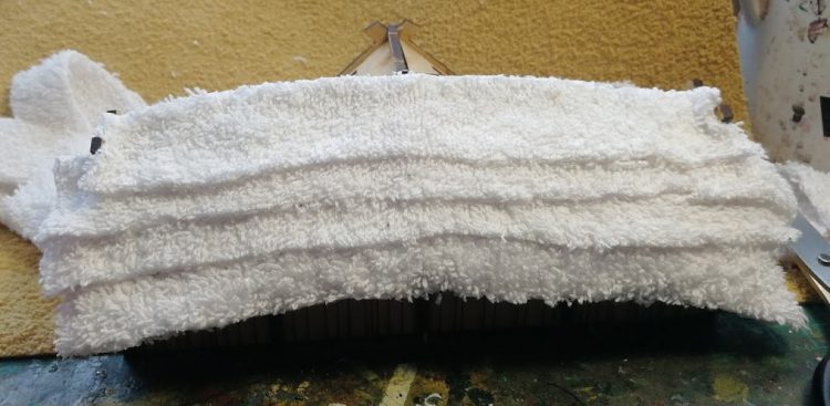 Now get your towelling and work out the grain - brush it out until you work out which way the fibres lay most comfortably. This is absolutely essential - if you get the grain going the wrong way, you'll end up with something that looks more like a hedgehog, or just a tangled mess. Once you're sure of the grain cut about 1" wide strips at 90 degrees to that grain, so the grain lies across the strip. These strips should be a little longer as the roof you're thatching is wide. Make sure when you're assembling your pile that you orient the strips so you know which direction the grain runs on them and they're all the same way.