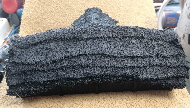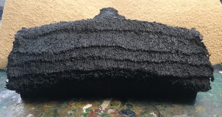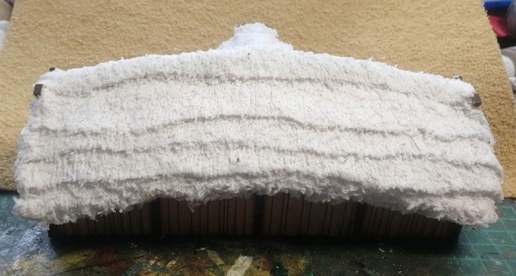 That done it's time for the fun bit. Water the PVA down a fair bit so it's nice and runny, then absolutely slather it on across the roof, working your large brush downwards to smooth out the fibres and get it lying right. You want to make sure every part of it is covered in the PVA, and it soaks in as much as possible.