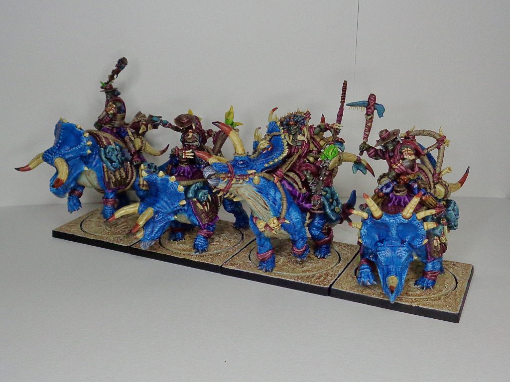Grotesque abominations whose sin of killing their mothers during birth propels them to atone for their entire lives through combat, the Warbred trade some of the resilience and dice stability that the Thunder Rider have for the potential for a more explosive turn. Their special rule Relentless Blows offers a chance to double your hit on a natural roll of “1”. This chance is represented by being slightly more expensive at 150 points compared to Thunder Rider’s 140.