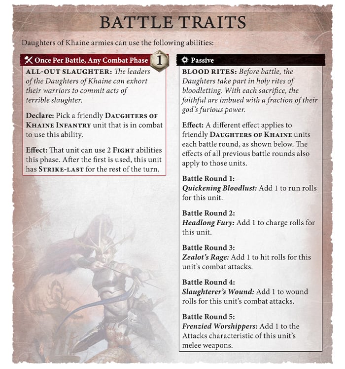 The main mechanic behind the Daughters of Khaine is the Blood Rites ability. As the game goes on they receive stacking bonuses such as +1 to run, +1 to charge, +1 to hit, +1 to wound, and finally +1 attacks in the last round, meaning DoK units will be in your opponent’s business early and often. This is a very powerful ability with the early abilities helping them get into combat and the later abilities helping the remnants of your forces keep up the fight.