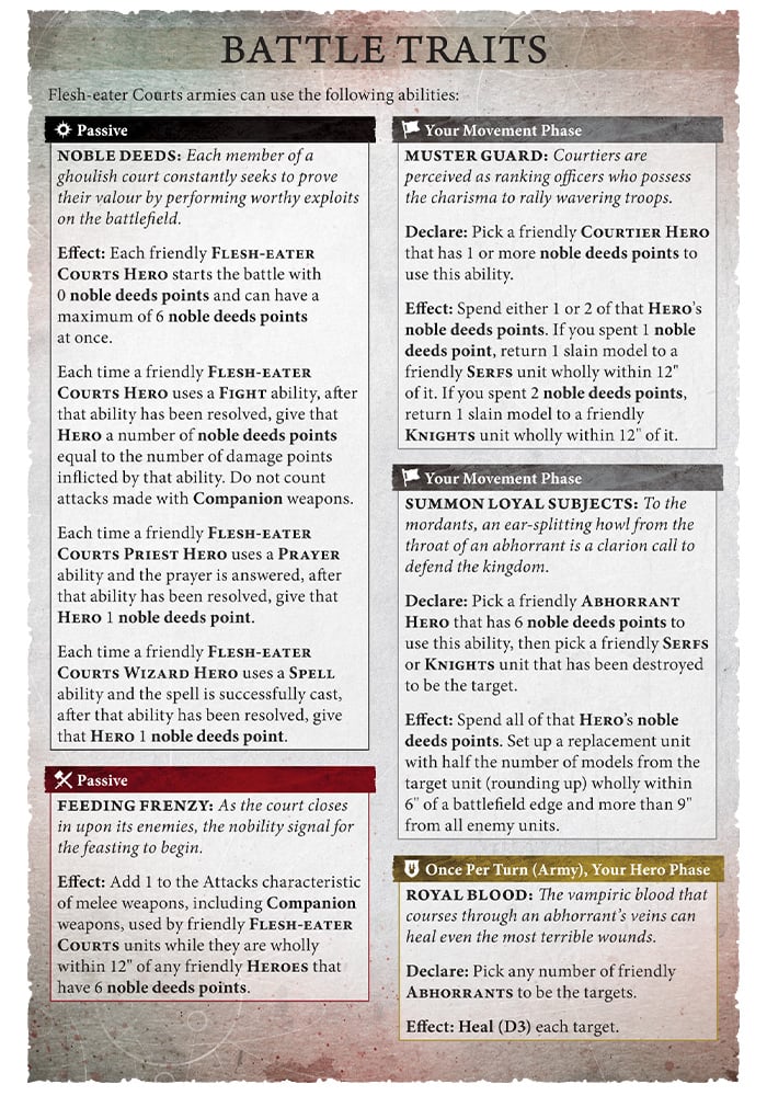 The Flesh Eater Courts faction pack will be very familiar to returning players from 3rd ed. Characters generate Noble Deed points by doing various acts of valor like fighting in combat or casting spells They can either bank those points to activate Feeding Frenzy, which adds an attack for all nearby units, or spend them to bring back dead models or entire units depending on the type of character they have.