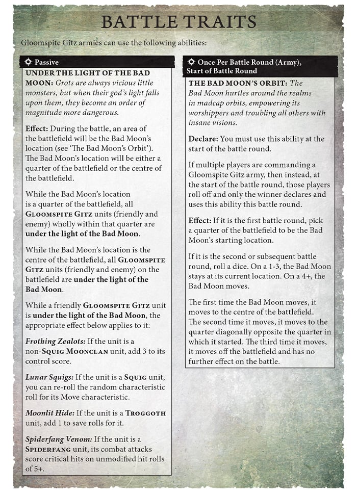 At the end of each of your own turns you pick 3 non-squig Moonclan units that are in combat, pile in with them (not attack, just pile in) and then deal mortal damage on a 2+ on D3. Nice for a little extra damage but it assumes that your Moonclan units survived combat to even use it. If you don’t have any Squig, Trogg, or Spiderfang units that’s the only time you’re taking it.