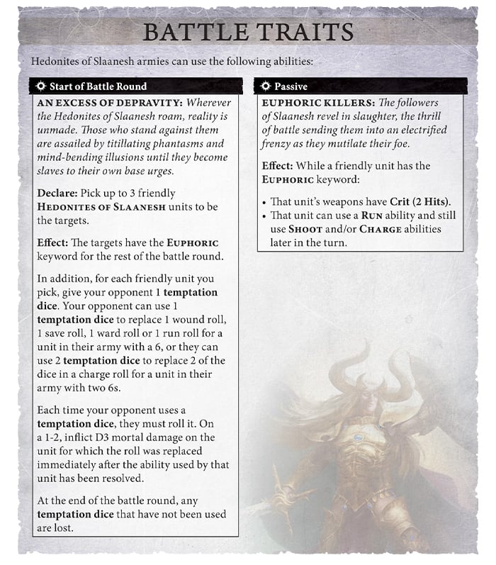 There are two battle traits here - Euphoric Killers gives Euphoric keyworded units the passive ability that gives weapons Crit (2 Hits) and allows the unit to use a run and still use shoot and charge abilities later in the turn. The second, An Excess of Depravity, feels like two or more abilities mashed together. It triggers at the start of the battle round and the affects are: