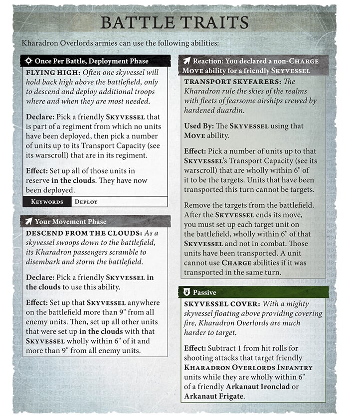 The new transport rule has you pick up and drop off friendly Kharadron models wholly within 6” of a boat when it moves. You do this during any move that the boat makes except for Charge moves; so that includes Redeploy moves during your opponent's turn! However, ferried units are not allowed to make Charge moves later in the turn themselves. The amount of units and models you can ferry around depends on the boat: