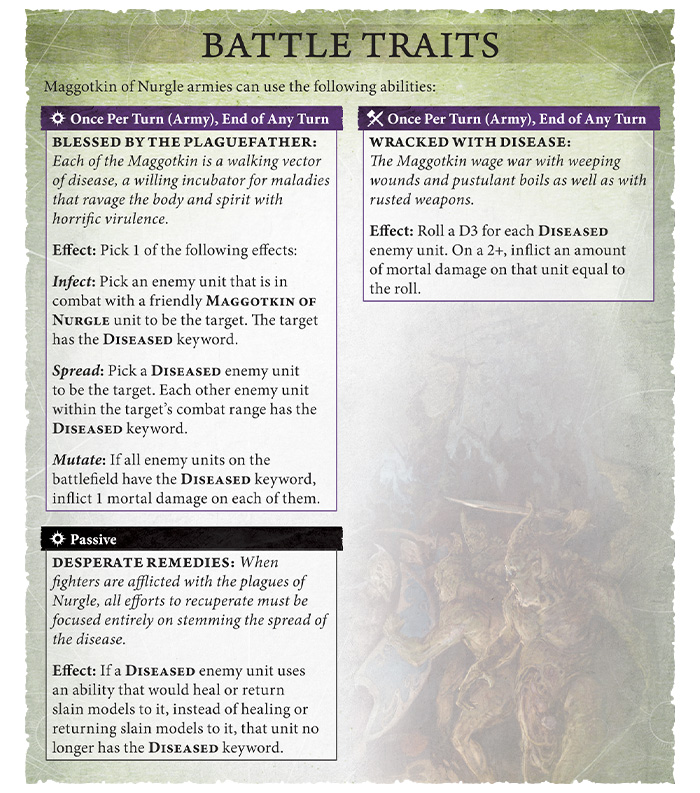 The Battle Traits in this Faction Pack are all centered around the Maggotkin’s Diseased mechanic. At the end of any turn you can use the Blessed By The Plaguefather ability to spread around the Diseased mechanic, allowing you to either give it to something in melee with any of your units, every unit in combat range of a unit that already has the keyword, or simply do a mortal wound to every Diseased unit if every enemy unit already has it. This means your most effective way to spread disease is to spread from something you already targeted.