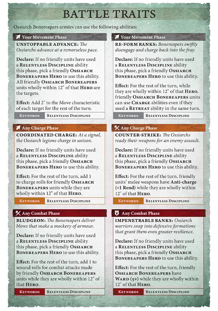 The Bonereapers gameplan revolves around their Relentless Discipline abilities, which allow you to bolster your forces at key points in the turn in order to better adapt to a given situation. All these abilities require units to be wholly within 12” of a targeted friendly hero and basically give you one of two choices in the Movement, Charge, and Combat Phase.