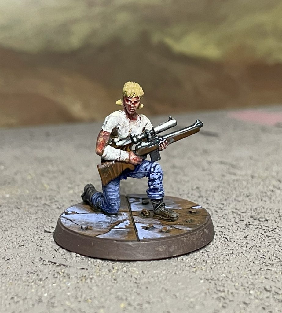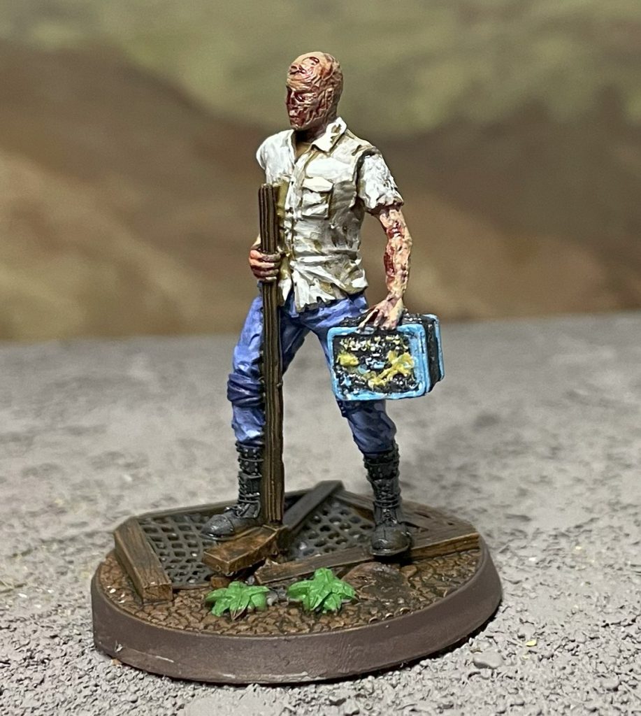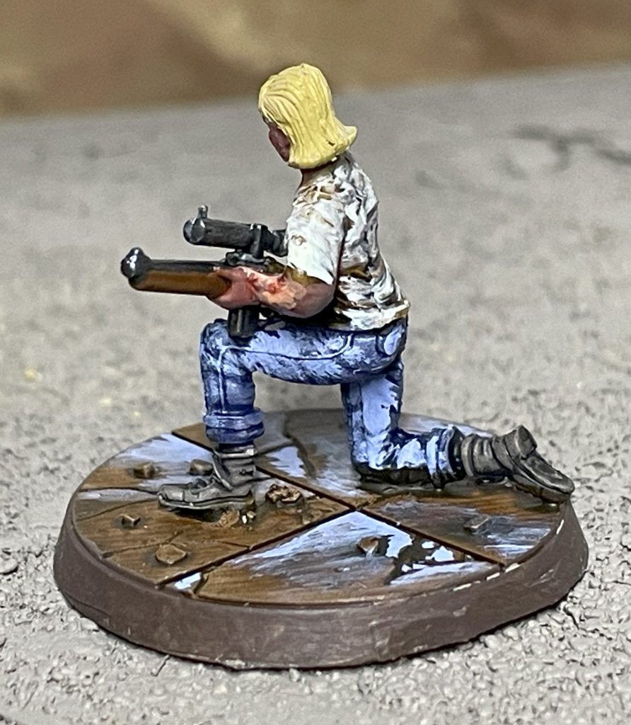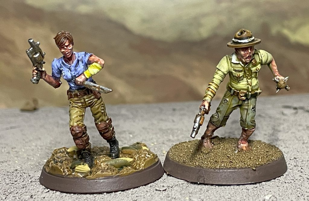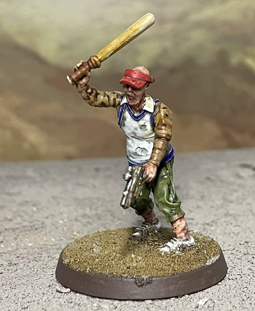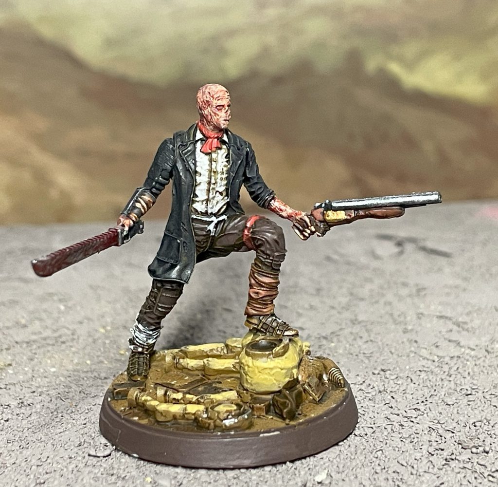 I didn’t want to stick to the patterns and colours of the Slog characters, so I went with a fairly standard fallout-ish palette of browns, greys, greens and blues. I wanted really high contrast to give a kind of comic book effect with the highlights, but didn't fully commit to it and as a result didn't really pull it off. There’s nothing particularly special or indeed that interesting about the cloth and clothing - paint it as you like!I spent more time on working out how to paint the uniquely disgusting ghoul skin tone and texture. Ghouls have a huge amount of skin texture that varies from the unnerving smooth and pink Walton Goggins to the absolutely terrifying Beatrix Russell of Fallout New Vegas, so I wanted to do a very simple and effective textured, varied skin effect to make sure these were very obviously ghouls even at tabletop distance.