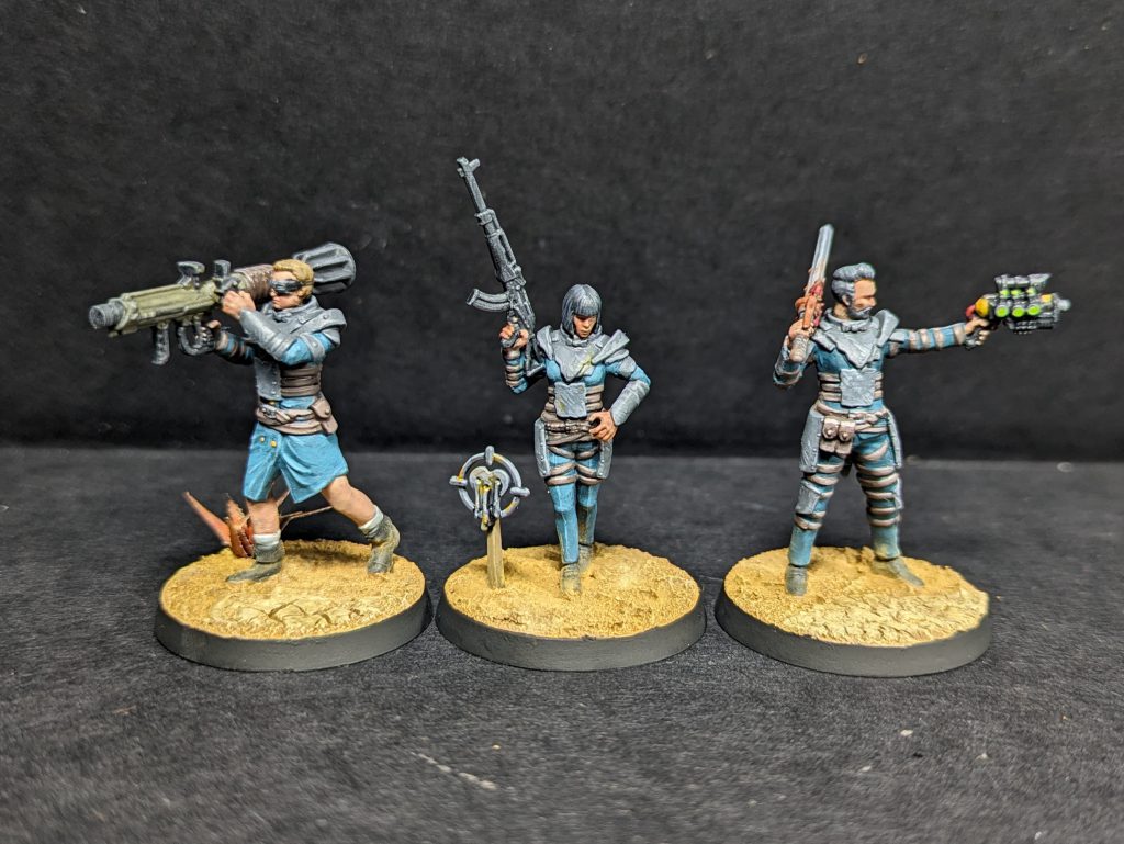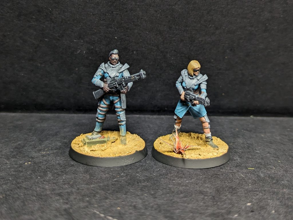 - Guns and Boots: Vallejo Black Grey, with highlights of 1:1 Black Grey:Neutral Grey on boots, and a drybrush of Neutral Grey over guns