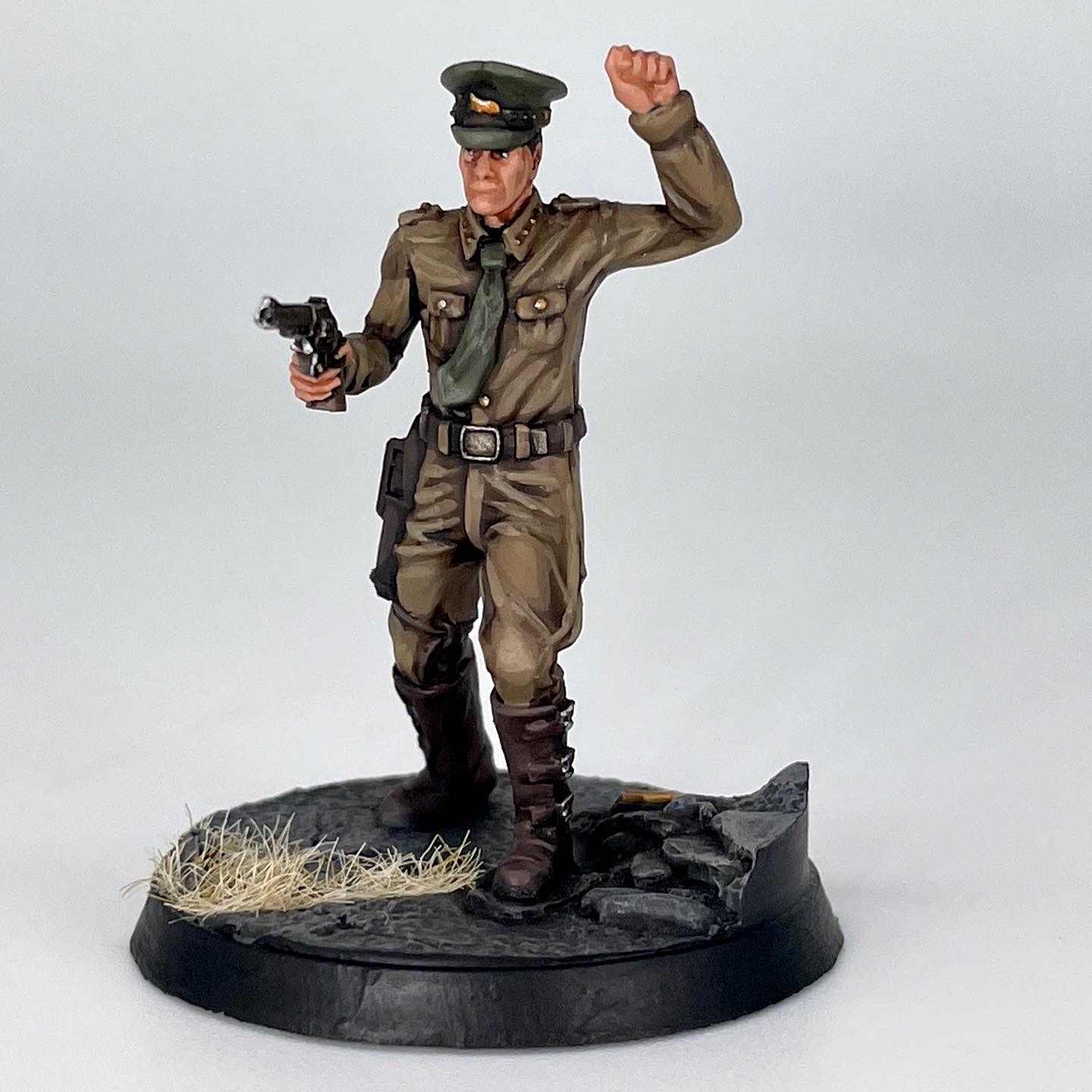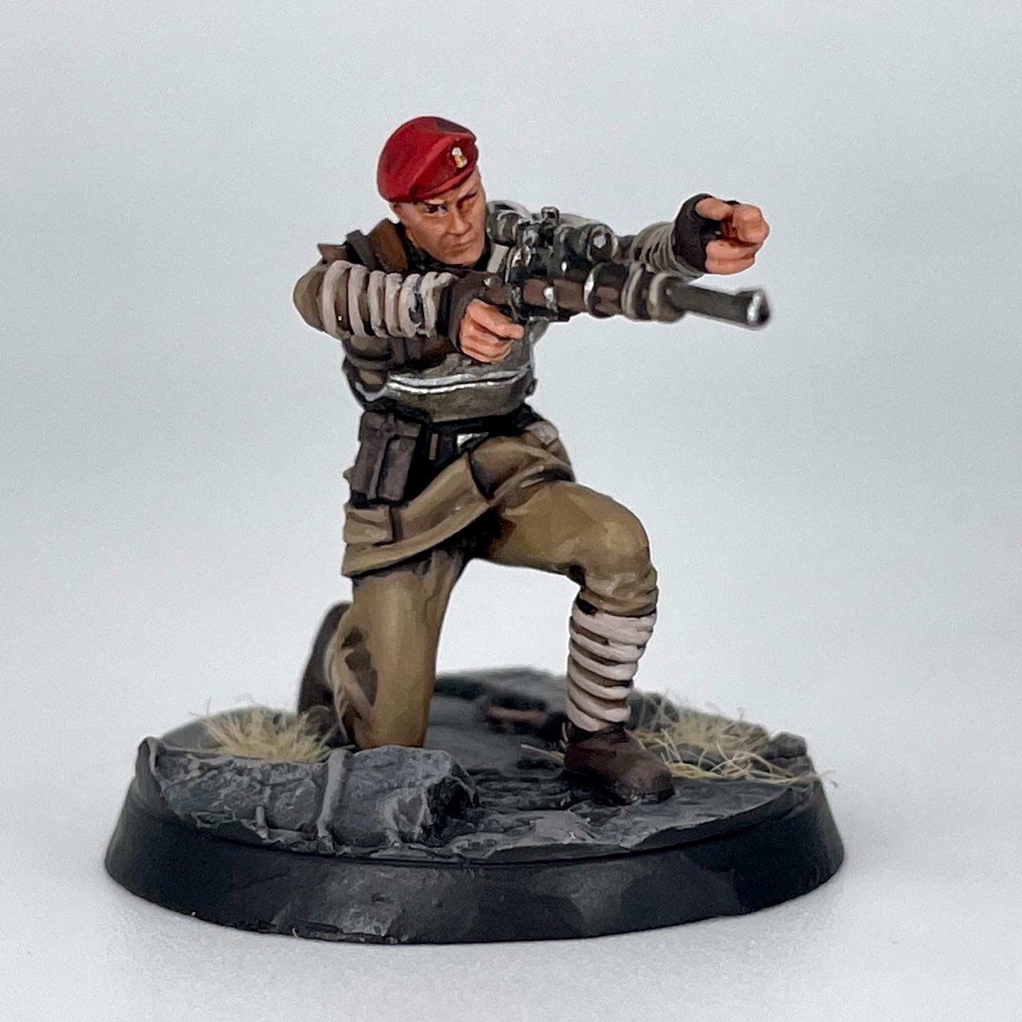 Fallout color palette, then build up from there. I reestablished my base colors for the most part, drybrushed the bases, and built their cloth uniforms back up with volumetric highlights. To get that dusty tone, as I mixed colors to get said highlights, I used a beige instead of a lighter shade of the base color. These models paint up quickly, as they generally are wearing pretty utilitarian uniforms with consistent materials, and don't have much in the way of extraneous detail.