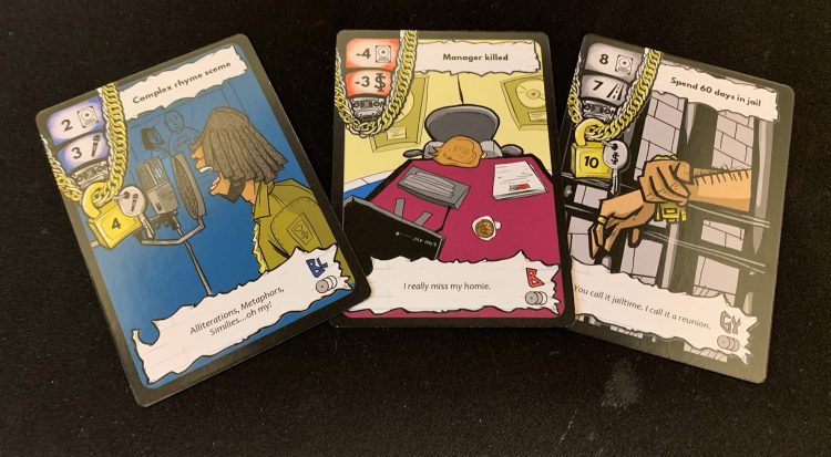 Similarly, the setting is reinforced across the other elements. The game's rounds represent an Album in your career with each turn (and thus card played) representing a Track. Mechanically the cards provide resources and are colored coded in a way that feeds the end-game scoring. Narratively, each represents highlight moments from your career. Whether you're spitting a Complex Rhyme Scheme, seeing your Manager Killed, or you have to Spend 60 Days in Jail, you'll live the life and career of your chosen Rapper.