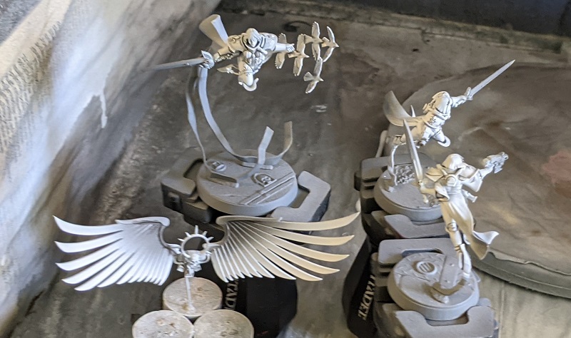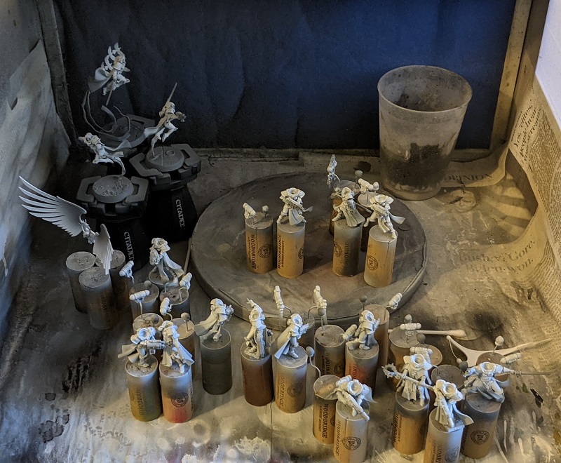 During the first week that composed this most recent "week" I assembled the bulk of the remaining normal sisters of battle for my army and airbrushed them with my usual style. (Grey Primer, Ulthuan Grey, White.) And no, I wasn't flossing my teeth. Picks make good mixing and cleaning tools for an airbrush and I have them in the bathroom closet anyways. I also got Celestine and a Dogmata airbrushed, which is my secret plan to try to catch up on PL.