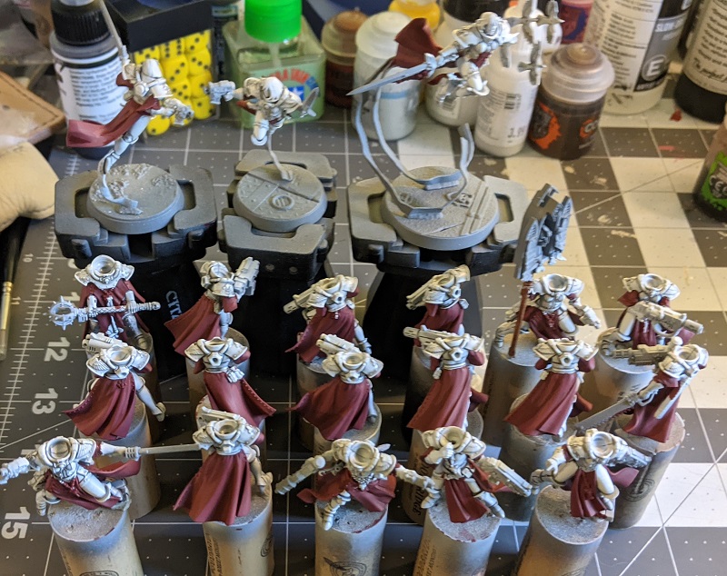 Fast forward to... well, Wednesday of the week after that. It took a bit of work to get them all done, but they're DONE, and ready to join the crusade. I did skip a few bits like the buttons on their robes and eye lenses on the helmeted sisters which I can get to when I have a bit more time, but nothing I think anyone's likely to notice from 3 feet away.