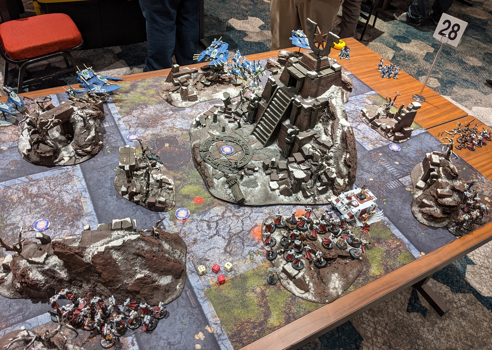 I didn't take any pictures of game three because I'm dumb. It was a 50PL doubles game on Narrow the Search, and I'd paired up with Phil and his SpeedWaagh versus a pair of Eldar, Joe and Quinn. Joe had a Wraithknight, a small flock of wraithseers, and a warlock. Quinn had a small pile of dark eldar and harlequins I will not even pretend to remember. To quickly summarize the game, Phil and I took control of the field early and scored a good bit, but the Orks took a bit of an early bruising. The Zephyrim dropped in on our turn 2 and proceeded to fail a 7 inch charge with a reroll, leaving them high, dry, and promptly murdered by the wraithknight. After a long, hard fought game where it looked like I might have had a shot of denying enough points to eke out a tie, my hopes were dashed when the last few shots available took out my outflanking squad of sisters who had flamethrowered a Dark Eldar Succubus and a squad of Incubi to death, and who were poised to deny an objective. Again, an excellent game with amazing players all around.