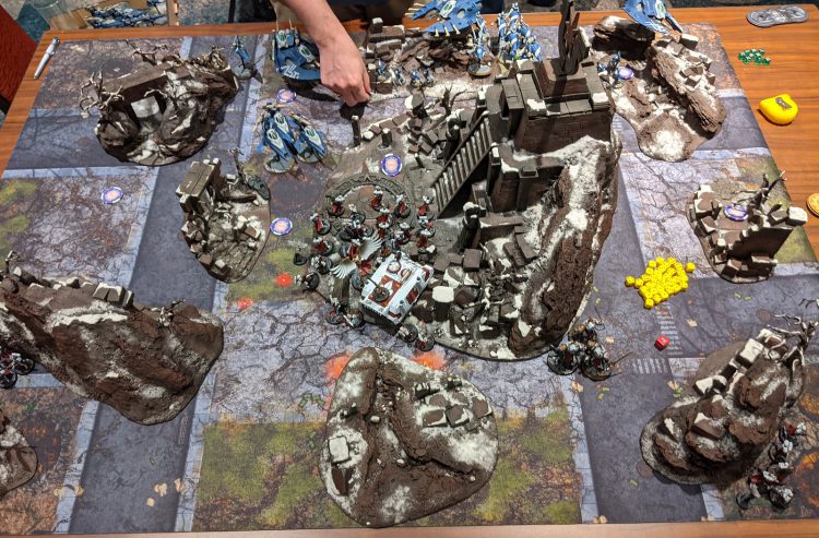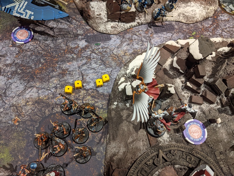 In my turn 3, him moving all his mobile elements to the center to deal with Celestine started to bite him. I was able to contest most of the rest of the objectives, denying him points, while on the right flank I had 2 objectives essentially uncontested after the Zephyrim charged into a squad of dire avengers and casually removed them from existence. The winds also started to turn my way again, blowing the objectives further towards my board edge. Speaking of casually deleting things from existence, my Canoness charged in and swatted an entire squad of shining spears out of the sky with a little help from the dogmata.