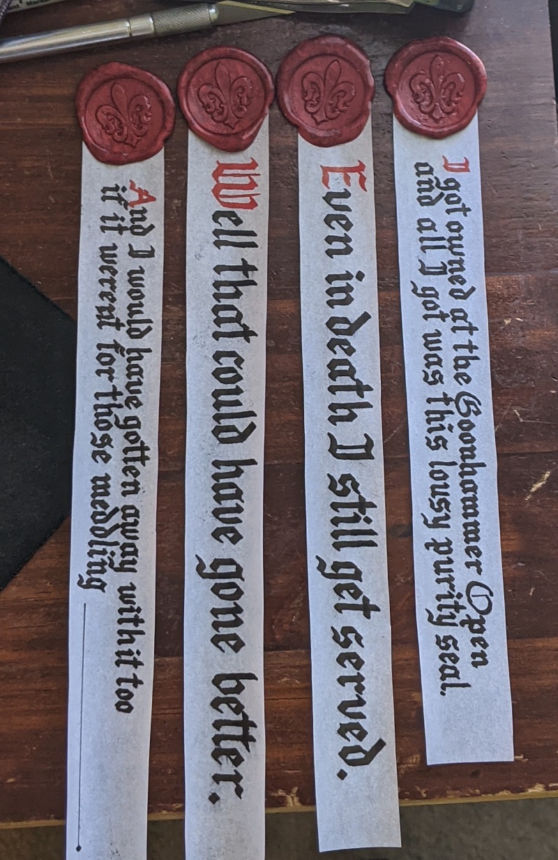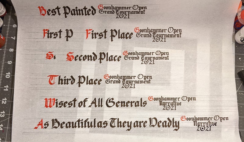 In one of the earlier articles, I had played around with some painted calligraphy. In the interim, I had... expanded that interest. Mostly as a creative break from plowing through Sisters squads. Then there was some discussion of getting little trophies made for the victors of the event. One thing lead to another, and suddenly I'm driving up to the cool art store in Annapolis to get some really nice paper to make awards with.