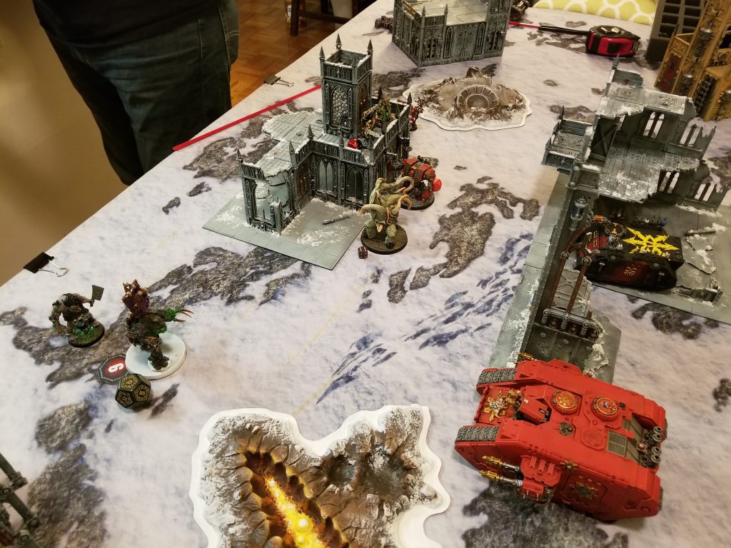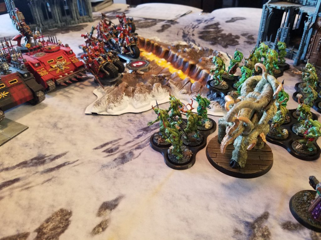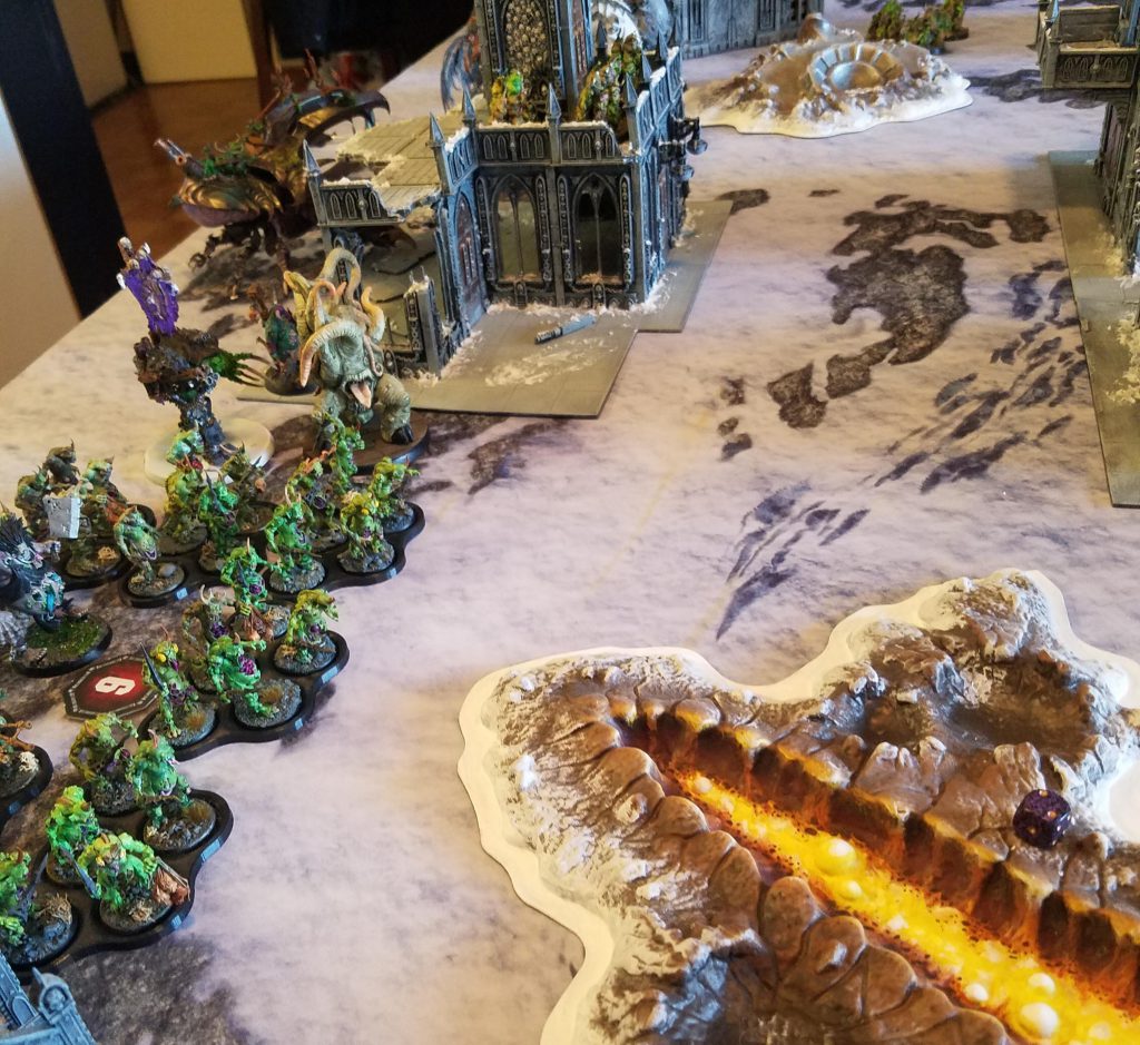 Brandon deployed more centrally, putting Nurglings on Objectives in his deployment zone and one at midfield. His goal was to score points early and often, then outlast me in later rounds as objective scoring became more scarce.