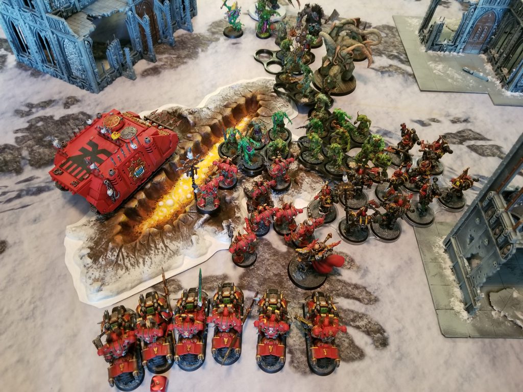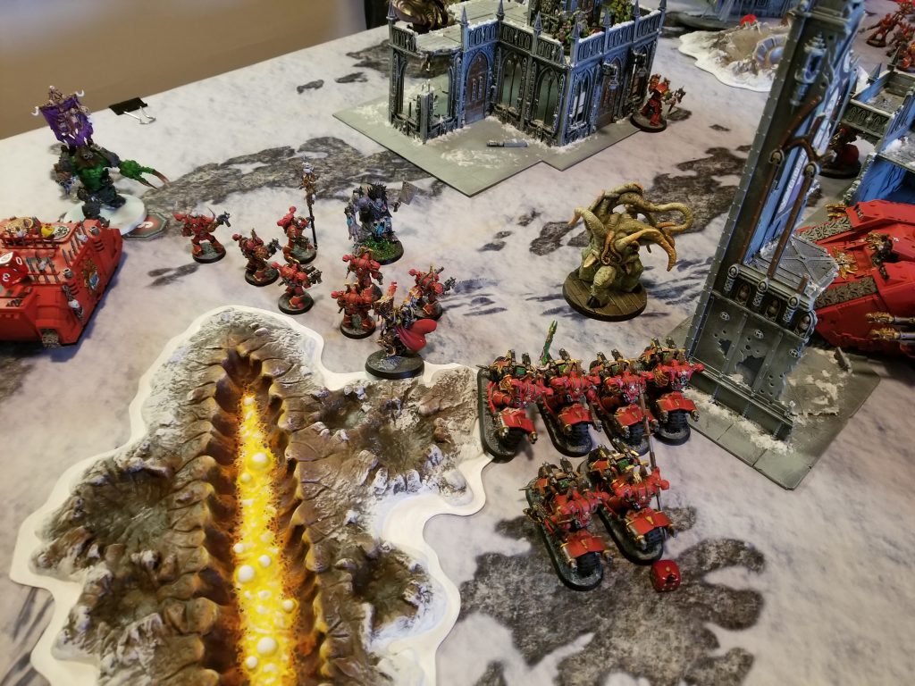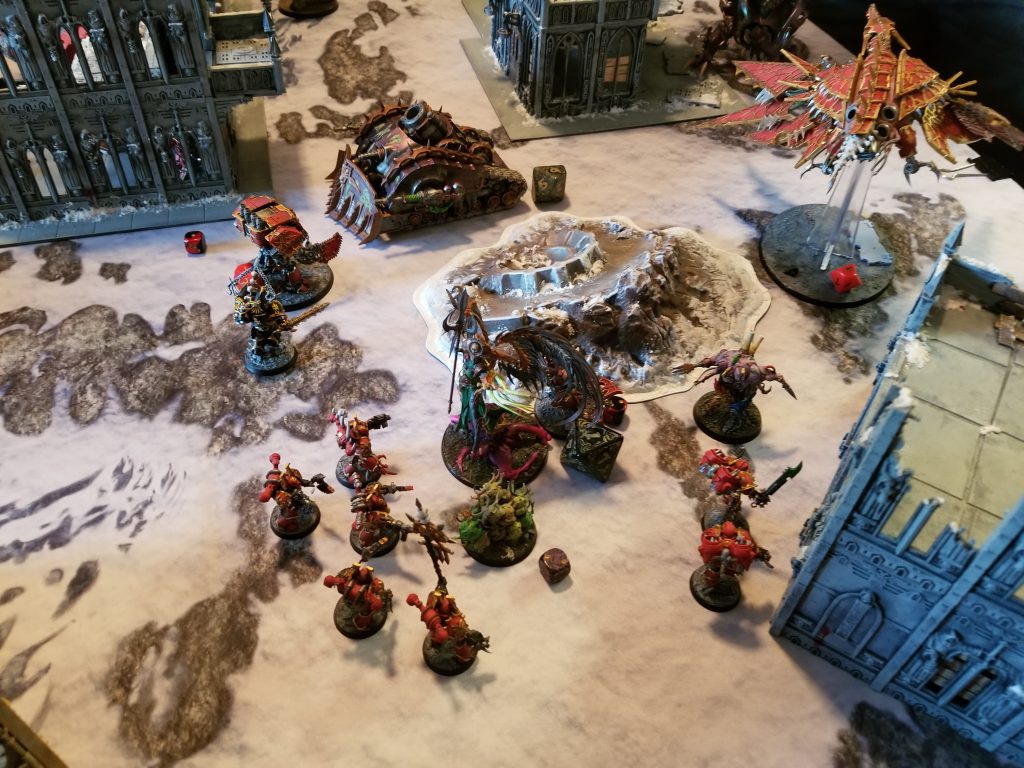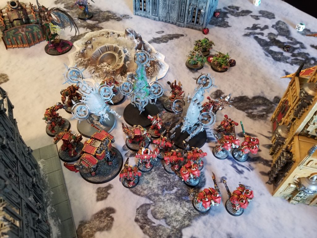 Using the ruins in the middle of the table to stay out of LOS and avoid Overwatch, the Terminators charge through the wall and are able to reach all three Drones. This clears the way for the Helbrute, Kharn, and the Berzerkers to charge. The drones die, but it's a painful process: The Fleshmower interrupts, killing 2 terminators, and each drone explodes, dealing 1 mortal wound to every unit within 7". This kills a number of Warp Talons and Berzerkers, and leaving Kharn with only 2 wounds as he consolidates into the Nurglings.